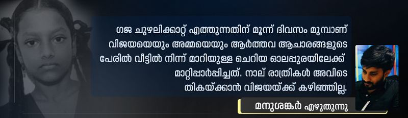 ഗജ ചുഴലിക്കാറ്റ് എത്തുന്നതിന് മൂന്ന് ദിവസം മുമ്പാണ് വിജയയെയും അമ്മയെയും ആര്ത്തവ ആചാരങ്ങളുടെ പേരില് വീട്ടില് നിന്ന് മാറിയുള്ള ചെറിയ ഓലപുരയിലേക്ക് മാറ്റിപാര്പ്പിച്ചത്. നാല് രാത്രികള് അവിടെ തികയ്ക്കാന് വിജയയ്ക്ക് കഴിഞ്ഞില്ല. ചുഴലിക്കാറ്റിനിടെ ഓലഷെഡിലേക്ക് വീണ തെങ്ങിനടയില് പെട്ട് വിജയയുടെ പ്രാണന് പൊലിഞ്ഞു. പരിക്കേറ്റ വിജയയുടെ മാതാവ് ആശുപത്രിയില് ഇപ്പോഴും ചികിത്സയിലാണ്.