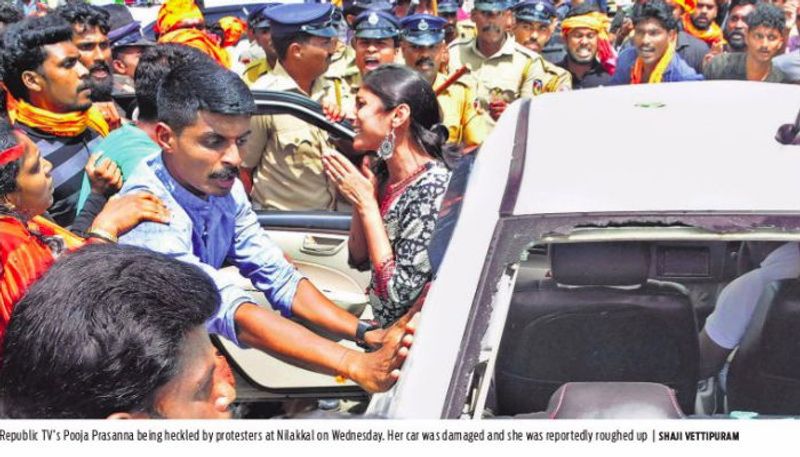 റിപ്പബ്ലിക് ടിവി റിപ്പോര്ട്ടര് പൂജ പ്രസന്ന, തന്റെ ടീമിനൊപ്പം കാറില് പമ്പയിലേക്ക് തിരിക്കവേയാണ് തടഞ്ഞുനിര്ത്തി അതിക്രമിക്കപ്പെട്ടത്. ഇവരെ കയ്യേറ്റം ചെയ്യുകയും അസഭ്യം വിളിക്കുകയും ചെയ്തുവെന്ന് മാത്രമല്ല, ന്യൂസ് സംഘത്തിന്റെ കൈവശമുണ്ടായിരുന്ന ഉപകരണങ്ങളും വാഹനവും ഇവര് നശിപ്പിച്ചു.
