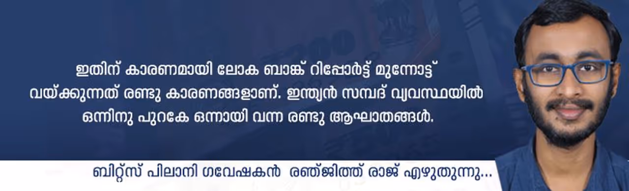 ഇതിന് കാരണമായി ലോക ബാങ്ക് റിപ്പോർട്ട് മുന്നോട്ടു വയ്ക്കുന്നത് രണ്ടു കാരണങ്ങളുണ്ട്. ഇന്ത്യൻ സമ്പദ് വ്യവസ്ഥയിൽ ഒന്നിനു പുറകേ ഒന്നായി വന്ന രണ്ടു ആഘാതങ്ങൾ. നോട്ടു നിരോധനവും, ചരക്കു സേവന നികുതിയും. ഇവ നടപ്പിലാക്കിയതിലെ അപാകതയാണ് ലോക ബാങ്ക് ചൂണ്ടിക്കാണിക്കുന്നത്. ഇതു രണ്ടും എറ്റവും കൂടുതൽ ആഘാതം സൃഷ്ടിച്ചത് രാജ്യത്തെ മധ്യ - ചെറുകിട വ്യവസായികൾക്കും അവരെ ആശ്രയിച്ചു ജീവിക്കുന്ന കോടിക്കണക്കിനുള്ള തൊഴിലാളികളിലുമാണ്. രാജ്യത്തെ 80 ശതമാനത്തോളം വരുന്ന ജനങ്ങളുടെ ജീവിതമാർഗ്ഗമായ അസംഘടിത മേഖലയാണ് നോട്ടു നിരോധനവും ജിഎസ്ടിയും കൊണ്ടു ഏറെ ദുരിതത്തിലായത്. ഇപ്പോൾ രാജ്യത്തെ ഉല്പ്പാദനത്തിലുണ്ടായ കുറവിനേക്കാൾ വലിയ പ്രശ്നം മറ്റൊന്നാണ്. അത് സാധന സേവനങ്ങളുടെ ഡിമാന്റിൽ ഉണ്ടായ കുറവാണ്.
