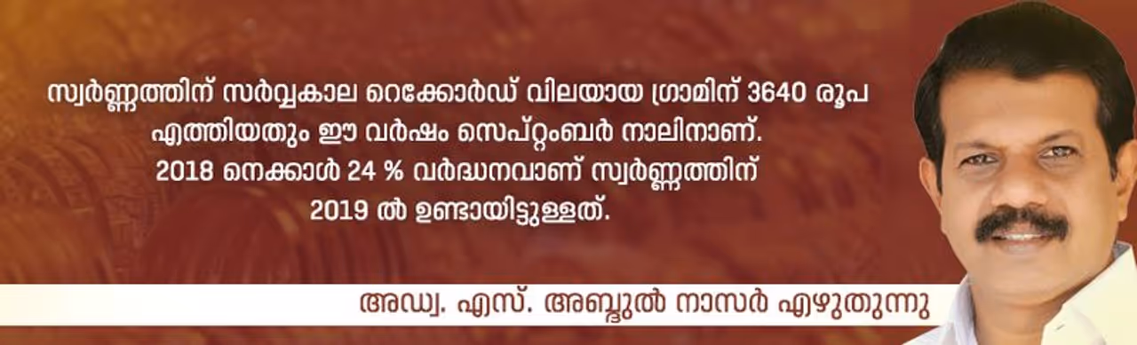 സ്വർണ്ണത്തിന് സർവ്വകാല റെക്കോർഡ് വിലയായ 3,640 രൂപ ഗ്രാമിന് എത്തിയതും ഈ വർഷം സെപ്റ്റംബർ നാലിനാണ്. 2018 നെക്കാൾ 24 % വർദ്ധനവാണ് സ്വർണ്ണത്തിൽ 2019 ൽ ഉണ്ടായിട്ടുള്ളത്. സ്വർണത്തിൽ നിക്ഷേപിച്ചവർക്ക് വൻ ലാഭമാണ് 2019 സമ്മാനിച്ചിട്ടുള്ളത്. 2000 ൽ സ്വർണ്ണവില ഗ്രാമിന് 550 രൂപയും പവന് 4,400 രൂപയുമായിരുന്നു.