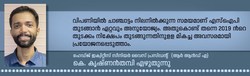 വിപണിയില് ചാഞ്ചാട്ടം നിലനില്ക്കുന്ന സമയമാണ് എസ്ഐപി തുടങ്ങാന് ഏറ്റവും അനുയോജ്യം. അതുകൊണ്ട് തന്നെ 2019 ന്റെ തുടക്കം നിക്ഷേപം തുടങ്ങുന്നതിനുളള മികച്ച അവസരമായി പ്രയോജനപ്പെടുത്താം.