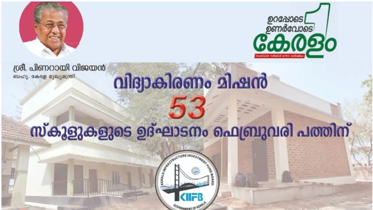 വിദ്യാകിരണം മിഷന്റെ ഭാഗമായി ഫെബ്രുവരി 10ന് സംസ്ഥാനത്തെ 53 സ്കൂളുകൾ അടിസ്ഥാനസൗകര്യ-ഭൗതിക വികസനം പൂർത്തിയാക്കി ഉദ്ഘാടനം ചെയ്യപ്പെടുകയാണ്