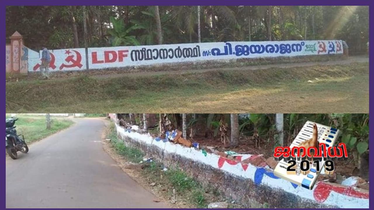 തലശ്ശേരി കൊമ്മൽവയലിൽ ഇടതുമുന്നണി സ്ഥാനാർത്ഥി പി ജയരാജനുവേണ്ടി ചുമരെഴുത്ത് നടത്തിയ മതിൽ തകർത്തു. ഇന്നലെ രാത്രിയാണ് സംഭവം.