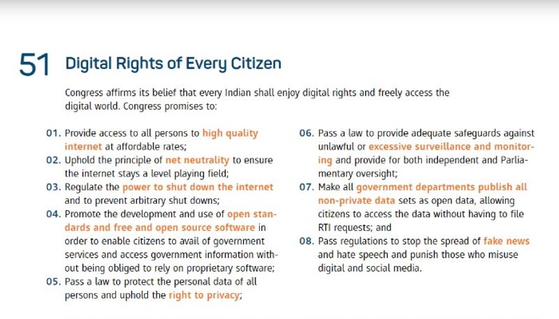 താങ്ങാനാകുന്ന നിരക്കിൽ എല്ലാ പൗരൻമാർക്കും അതിവേഗ ഇന്റെർനെറ്റ് സൗകര്യം ലഭ്യമാക്കുമെന്നതാണ് കോൺഗ്രസ് പ്രകടന പത്രികയിലെ ഡിജിറ്റൽ വിഭാഗത്തിലെ ആദ്യ വാഗ്ദാനം. ഇന്റർനെറ്റ് സേവനം നിർത്തിവയ്ക്കുവാനുള്ള അധികാരം പരിമിതപ്പെടുത്തുമെന്നും വാഗ്ദാനമുണ്ട്. ഇപ്പോൾ ചെയ്യുന്നത് പോലെ പ്രശ്നബാധിത മേഖലകളിൽ ഇന്റെർനെറ്റ് സേവനങ്ങൾ നിശ്ചലമാക്കുന്ന രീതി അവസാനിപ്പിക്കുമെന്നാണ് വാഗ്ദാനം.