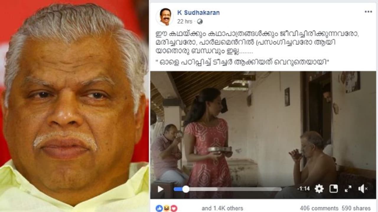 " ഓളെ പഠിപ്പിച്ച് ടീച്ചർ ആക്കിയത് വെറുതെയായി" എന്ന കുറിപ്പോടെ സുധാകരൻ ഇന്നലെ ഫേസ്ബുക്കിൽ പങ്ക് വച്ച ഒന്നര മിനുട്ട് ദൈർഘ്യമുള്ള പ്രചരണ പരസ്യമാണ് വിവാദമായിരിക്കുന്നത്.