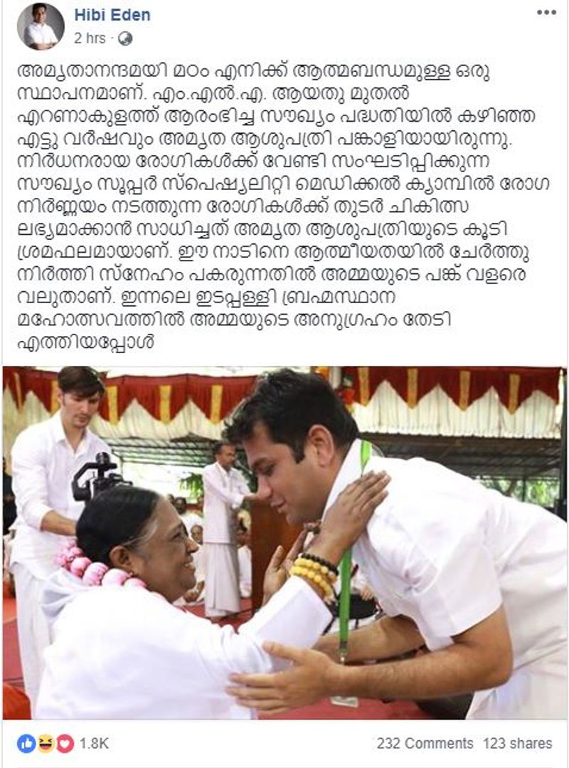 അമൃതാനന്ദമയി മഠം തനിക്ക് ഏറെ ആത്മബന്ധമുള്ള ഒരു സ്ഥാപനമാണ്. ഇന്നലെ ഇടപ്പള്ളി ബ്രഹ്മസ്ഥാന മഹോത്സവത്തിൽ അമ്മയുടെ അനുഗ്രഹം തേടി എത്തിയെന്നും ഹൈബി ഫേസ്ബുക്ക് കുറിപ്പിലൂടെ പറഞ്ഞു. എംഎൽഎ ആയത് മുതൽ എറണാകുളത്ത് ആരംഭിച്ച സൗഖ്യം പദ്ധതിയിൽ കഴിഞ്ഞ എട്ടു വർഷവും അമൃത ആശുപത്രി പങ്കാളിയായിരുന്നു.