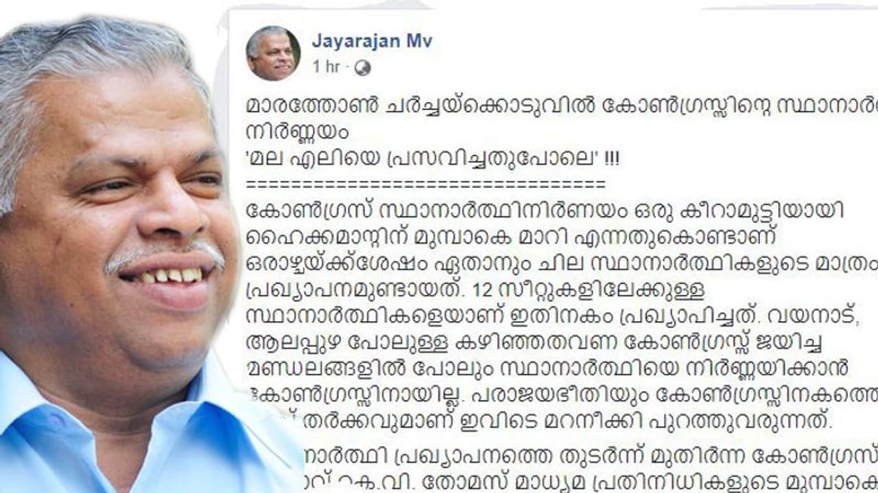 വയനാട്, ആലപ്പുഴ പോലുള്ള കഴിഞ്ഞതവണ കോൺഗ്രസ്സ് ജയിച്ച മണ്ഡലങ്ങളിൽ പോലും സ്ഥാനാര്ത്ഥികളെ നിശ്ചയിക്കാന് കഴിയാത്ത കോണ്ഗ്രസ് പാര്ട്ടി 12 സീറ്റുകളിലേക്കുള്ള സ്ഥാനാർത്ഥികളെയാണ് ഇതുവരെ പ്രഖ്യാപിച്ചത്. അത് തന്നെ 'മല എലിയെ പ്രസവിച്ചതു പോലെ'യാണെന്നും എം വി ജയരാജന് അഭിപ്രായപ്പെട്ടു. പാര്ട്ടിയിലെ തര്ക്കം പോലും പരിഹരിക്കാന് കഴിയാത്ത കോണ്ഗ്രസിനടുത്തേക്കാണ് കേരളാ കോണ്ഗ്രസ് എമ്മിലെ തര്ക്കം പരിഹരിക്കണമെന്നാവശ്യപ്പെട്ട് പി ജെ ജോസഫ് ചെന്നതെന്നും എം വി ജയരാജാന് തന്റെ ഫേസ്ബുക്ക് പേജില് എഴുതുന്നു.