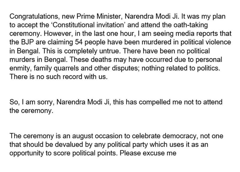 പിൻമാറിയതിന് പിന്നാലെ മമത മോദിക്ക് ഒരു കത്തും നൽകി. ''അഭിനന്ദനങ്ങൾ, നിയുക്ത പ്രധാനമന്ത്രീ. ഭരണഘടനയെ മാനിച്ച് താങ്കളുടെ ക്ഷണം സ്വീകരിക്കാനായിരുന്നു എന്റെ തീരുമാനം. എന്നാൽ പശ്ചിമബംഗാളിൽ 54 ബിജെപി പ്രവർത്തകർ രാഷ്ട്രീയസംഘർഷങ്ങളിൽ കൊല്ലപ്പെട്ടെന്ന് ബിജെപി അവകാശപ്പെടുന്നതായി മാധ്യമറിപ്പോർട്ടുകൾ കാണുന്നു. ഇത് പൂർണമായും തെറ്റാണ്. പശ്ചിമബംഗാളിൽ രാഷ്ട്രീയക്കൊലപാതകങ്ങൾ ഉണ്ടായിട്ടില്ല. വ്യക്തി വിരോധമോ, കുടുംബങ്ങൾ തമ്മിലുള്ള വഴക്കോ, മറ്റ് സംഘർഷങ്ങളോ രാഷ്ട്രീയമായി ബന്ധമുള്ളതല്ല. അത്തരം ഒരു രേഖകളും ഞങ്ങളുടെ പക്കലില്ല.