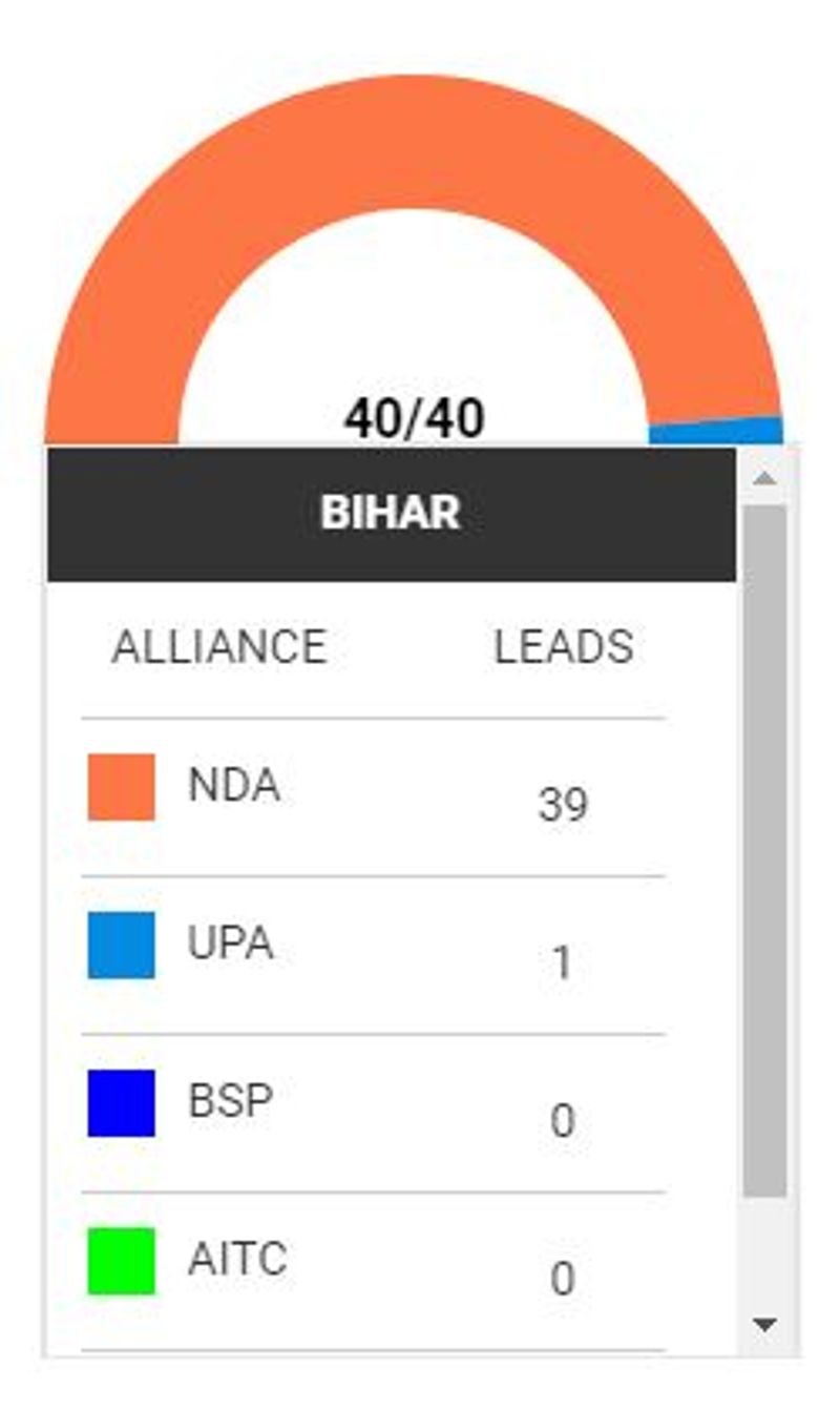 ബിഹാറിൽ ഇത്തവണ ആകെയുള്ള 40 സീറ്റുകളിൽ 39 സീറ്റുകളും എൻഡിഎ തൂത്തുവാരിയിരുന്നു. ഒറ്റ സീറ്റ് മാത്രമാണ് യുപിഎയ്ക്ക് കിട്ടിയത്. ബിജെപിയും ജെഡിയുവും 17 സീറ്റുകളിൽ വീതമാണ് മത്സരിച്ചത്. ബിജെപി എല്ലാ സീറ്റുകളിലും ജയിച്ചു. ജെഡിയു 16 സീറ്റുകളിലും. സഖ്യകക്ഷിയായ രാംവിലാസ് പസ്വാന്റെ എൽജെപി 6 സീറ്റുകളിലും ജയിച്ചു.