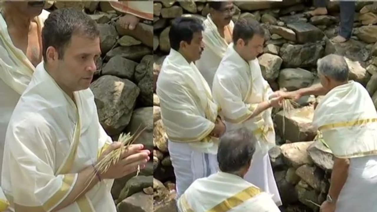 1991 ൽ പാപനാശിനിയിൽ രാജീവ് ഗാന്ധിയുടെ ചിതാഭസ്മം കെ കരുണാകരനാണ് തിരുനെല്ലിയിൽ ഒഴുക്കിയത്. ക്ഷേത്രത്തിൽ നിന്ന് എഴുനൂറ് മീറ്റര് ദൂരെയാണ് പാപനാശിനി തീരം. അവിടേക്ക് നടന്നാണ് രാഹുൽ എത്തിയത്. രാഹുൽ ഗാന്ധി വരുന്ന പശ്ചാത്തലത്തിൽ വൻ സുരക്ഷയാണ് ക്ഷേത്രത്തിലും പരിസരത്തും ഒരുക്കിയിരുന്നത്. മറ്റാര്ക്കും ഇന്ന് ബലിതര്പ്പണത്തിന് അവസരം നൽകിയിരുന്നുമില്ല. ഇഎൻ കൃഷ്ണൻ നമ്പൂതിരിയാണ് ചടങ്ങുകൾക്ക് നേതൃത്വം നൽകിയത് .