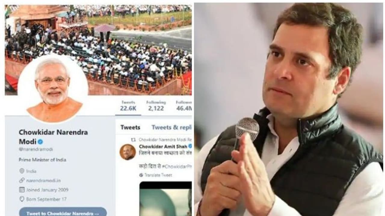 രാഹുൽ ഗാന്ധിയുടെ 'ചൗകിദാർ ചോർ ഹേ' മുദ്രാവാക്യത്തിന് മറുപടിയായി ബിജെപി 'ഹം ഭീ ചൗകിദാർ' എന്ന ഹാഷ്ടാഗ് ഉള്പ്പെടുത്തി പ്രചാരണം തുടങ്ങിയിരുന്നു. ഇതിന് പിന്നാലെയാണ് ട്വിറ്ററിലെ പേര് മാറ്റം. റഫാല് അഴിമതി അടക്കമുള്ള ഉന്നിയിക്കുമ്പോള് രാഹുല് ഗാന്ധി ഏറ്റവുമധികം ഉപയോഗിച്ചിരുന്ന പരാമര്ശമാണ് കാവല്ക്കാരന് കള്ളനാണെന്നുള്ളത്.