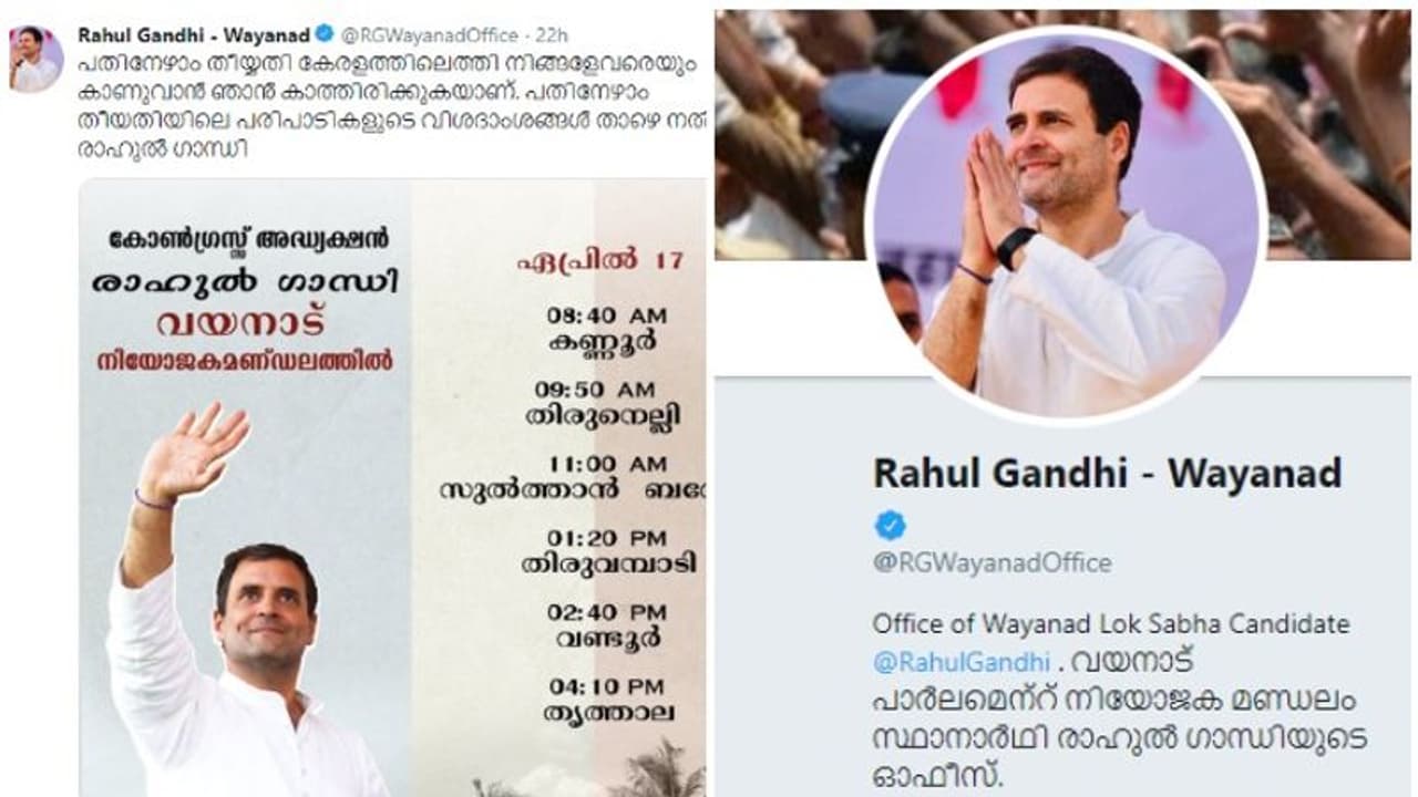 എന്നാല്, വയനാട്ടിലേക്ക് വെറുമൊരു വരവല്ല രാഹുലിന്റേതെന്നാണ് പ്രചാരണ രീതികള് തെളിയിക്കുന്നത്. വയനാടിന് വേണ്ടി രാഹുല് പുതിയ ട്വിറ്റര് പേജ് ആരംഭിച്ചിരിക്കുകയാണ്. വയനാട്ടിലെ പ്രവര്ത്തനങ്ങള് സാമൂഹ്യ മാധ്യമങ്ങളിലൂടെ കൂതുതല് പേരില് എത്തിക്കുകയാണ് ലക്ഷ്യം. മലയാളത്തിലാണ് രാഹുല് ഗാന്ധി- വയനാട് എന്ന പേജില് വരുന്ന ട്വീറ്റുകള്.