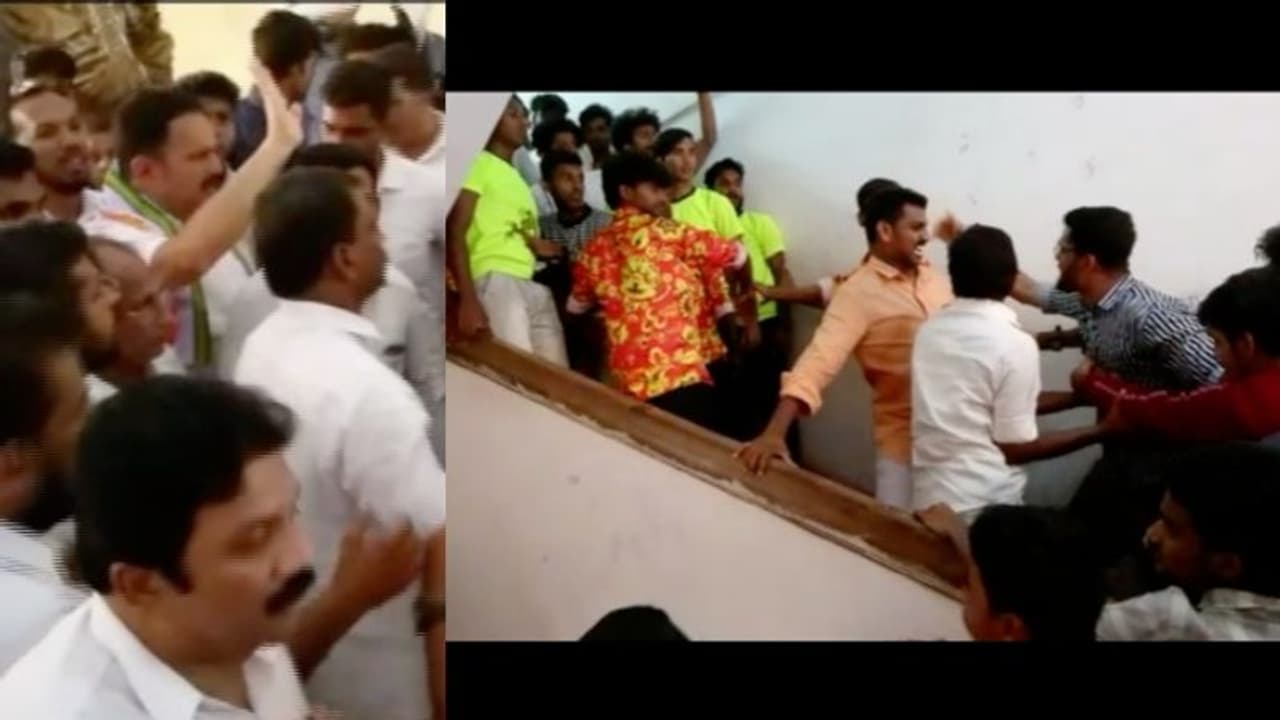 കെട്ടിട്ടത്തിലേക്കുള്ള ഗോവണി പടിയില് ഇരുന്നു കൊണ്ട് എസ്എഫ്ഐ പ്രവര്ത്തകര് മുരളീധരനെതിരെ മുദ്രാവാക്യം വിളിച്ചു. എസ്എഫ്ഐക്കാരുടെ നടപടി ചോദ്യം ചെയ്ത് കെഎസ്.യു-എംഎസ്എഫ് പ്രവര്ത്തകരും മുന്നോട്ട് വന്നതോടെ ഇരുകൂട്ടരും തമ്മില് വാക്കേറ്റമായി.