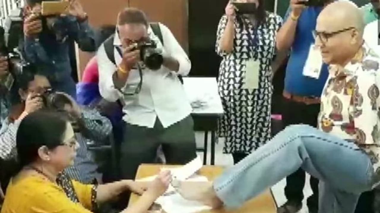 കൈകളില്ലാത്തതിനാല് കാലുകളിലാണ് പോളിംഗ് ഓഫീസര് മഷി പുരട്ടിയത്. മധ്യപ്രദേശിലെ ഇന്ഡോറിലെ പോളിംഗ് ബൂത്തില് നിന്നുള്ള ചിത്രമാണിത്