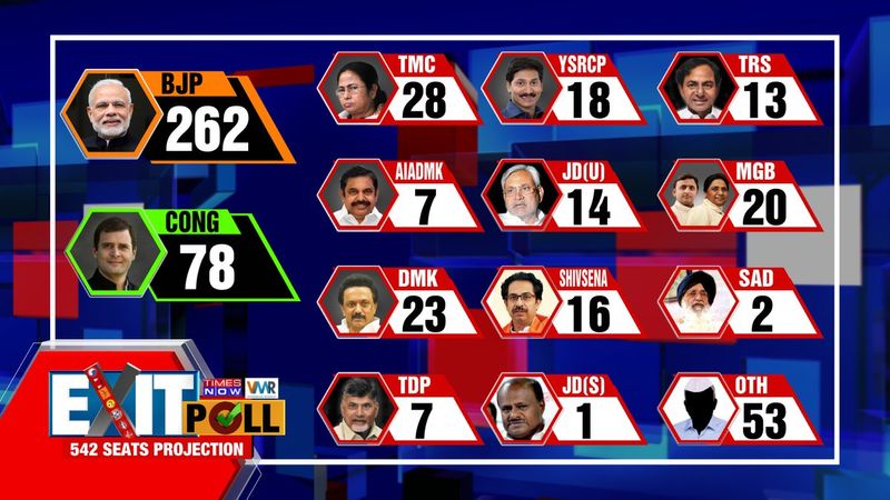 ബിജെപിക്ക് ആകെ 262 സീറ്റുകൾ കിട്ടും, കോൺഗ്രസിന് 78 സീറ്റുകൾ മാത്രം. പ്രതിപക്ഷ മഹാസഖ്യം രൂപീകരിക്കാൻ പക്ഷേ, കോൺഗ്രസിന് കഴിയില്ല. ബിജെപി സഖ്യകക്ഷികളെയെല്ലാം ചേർത്ത് എൻഡിഎ സർക്കാരുണ്ടാക്കുമെന്നും ടൈംസ് നൗ പറയുന്നു.
