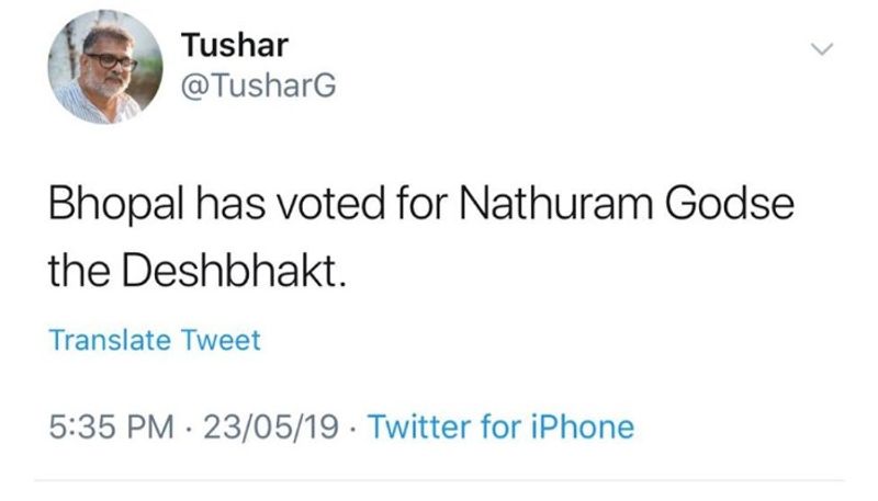 ഭോപ്പാല്: ഭോപ്പാലില് ബിജെപി സ്ഥാനാര്ത്ഥി പ്രഗ്യാ സിംഗ് ഠാക്കൂറിന്റെ വിജയത്തെ തള്ളി മഹാത്മാഗാന്ധിയുടെ ചെറുമകന്റെ മകന് തുഷാര് ഗാന്ധി. ദേശഭക്തനായ നാഥുറാം ഗോഡ്സേയേക്ക് ഭോപ്പാല് വോട്ട് ചെയ്തെന്നായിരുന്നു തുഷാറിന്റെ ട്വീറ്റ്. ഗോഡ്സേ രാജ്യസ്നേഹി ആയിരുന്നു, ആണ്, ആയിരിക്കും എന്ന പ്രഗ്യാസിംഗിന്റെ വാദം വലിയ വിമര്ശനങ്ങള്ക്ക് വഴിവെച്ചിരുന്നു. ഗോഡ്സേയെ തീവ്രവാദിയെന്ന് വിളിക്കുന്നവർക്കുള്ള മറുപടി ഈ തെരഞ്ഞെടുപ്പ് കാലത്ത് ലഭിക്കുമെന്നും ഗോഡ്സെ തീവ്രവാദിയാണെന്നു പറയുന്നവർ ആത്മപരിശോധന നടത്തണമെന്നും പ്രഗ്യ സിംഗ് പറഞ്ഞിരുന്നു.