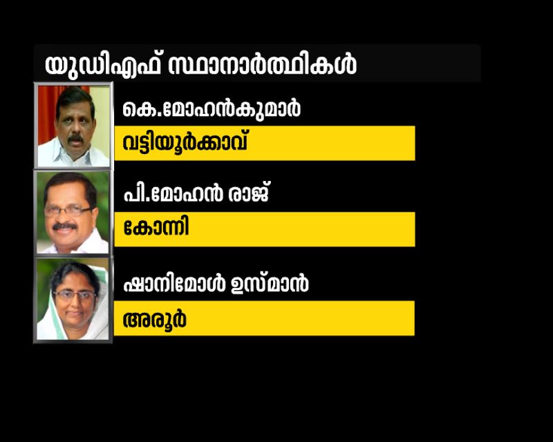 ദില്ലി/ തിരുവനന്തപുരം: അഞ്ച് നിയമസഭാ മണ്ഡലങ്ങളിലേക്കുള്ള യുഡിഎഫ് സ്ഥാനാർത്ഥിപ്പട്ടികയായി. അരൂരിൽ അഡ്വ. ഷാനിമോൾ ഉസ്മാനും, കോന്നിയിൽ പി മോഹൻരാജും, വട്ടിയൂർക്കാവിൽ മുൻ എംഎൽഎയും മനുഷ്യാവകാശ കമ്മീഷൻ അംഗവുമായ ഡോ. കെ മോഹൻകുമാറും എറണാകുളത്ത് മുൻ ഡെപ്യൂട്ടി സ്പീക്കർ ടി ജെ വിനോദുമാണ് സ്ഥാനാർത്ഥികൾ. മഞ്ചേശ്വരത്ത് ലീഗ് സ്ഥാനാർത്ഥിയായി എം സി ഖമറുദ്ദീനെ പ്രഖ്യാപിച്ചിരുന്നു.