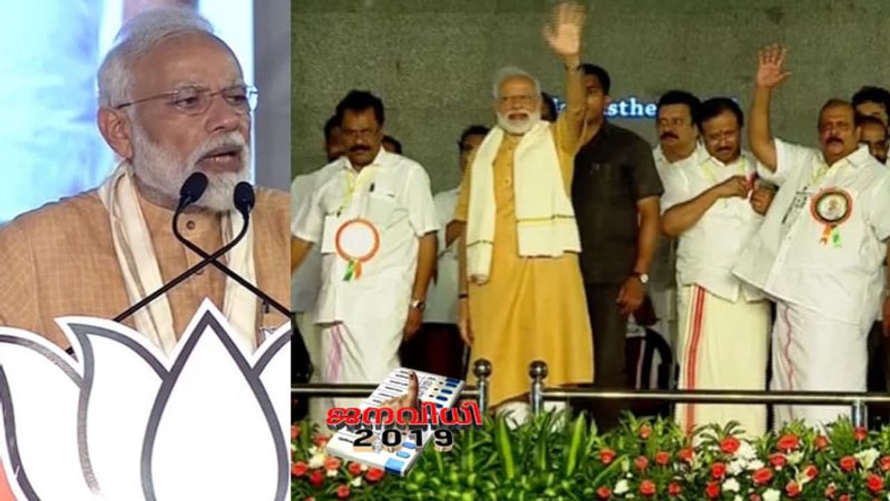 ശബരിമല വിഷയം തെരഞ്ഞെടുപ്പില് ചര്ച്ചയാകില്ലെന്ന് മുന്പ് പറഞ്ഞ സംസ്ഥാന അധ്യക്ഷന് പി എസ് ശ്രീധരന്പിള്ള പ്രധാനമന്ത്രിയുടെ സാന്നിധ്യത്തില് വേദിയില് നിലപാട് തിരുത്തി. ശബരിമല ചര്ച്ചയാകില്ലെന്ന പിള്ളയുടെ നേരത്തെയുള്ള പ്രസ്താവന ബിജെപിയെ പ്രതിരോധത്തിലാക്കിയിരുന്നു. രാഹുല് ഗാന്ധിയുടെ പേര് പരാമര്ശിക്കാതെയായിരുന്നു മോദിയുടെ ഒളിയമ്പ്. നികുതി വെട്ടിച്ചവര് രാഷ്ട്രീയ ജാമ്യം നേടാനായി കേരളത്തില് മത്സരിക്കാനെത്തിയിരിക്കുന്നുവെന്നായിരുന്നു മോദിയുടെ പരിഹാസം.