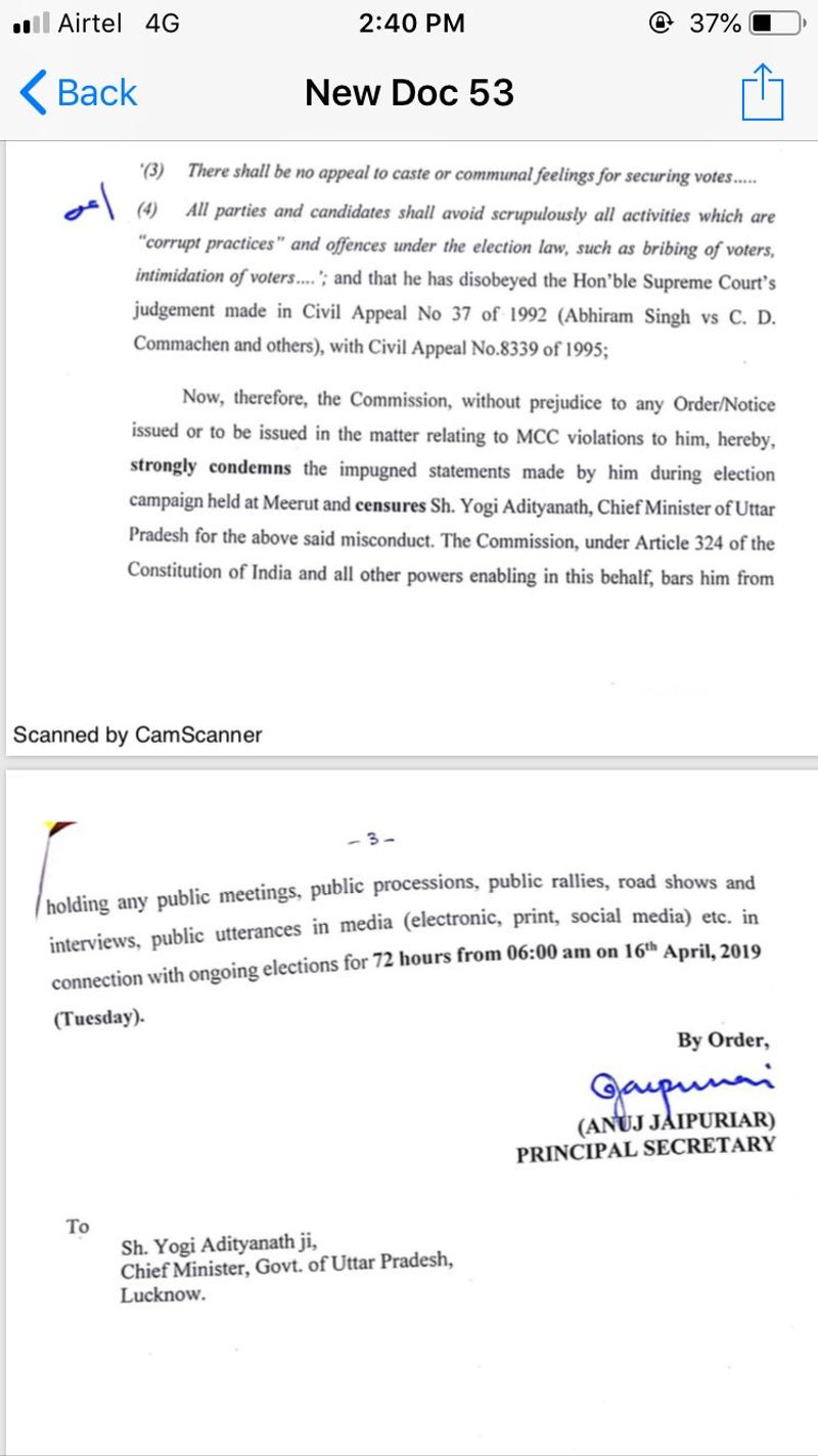 വർഗീയ - വിദ്വേഷ പരാമർശങ്ങൾ നടത്തിയതിനാണ് ഇരുവർക്കും തെരഞ്ഞെടുപ്പ് കമ്മീഷൻ വിലക്കേർപ്പെടുത്തിയിരിക്കുന്നത്. ആദ്യഘട്ട തെരഞ്ഞെടുപ്പിന്റെ പ്രചാരണം അവസാനിക്കുന്നതിന് മണിക്കൂറുകൾക്ക് മുമ്പാണ് മീററ്റിൽ നടന്ന റാലിയിൽ യോഗി എസ്പി - ബിഎസ്പി സഖ്യത്തെയും കടന്നാക്രമിച്ചത്. മുസ്ലിം ലീഗിനെ 'പച്ച വൈറസ്' എന്ന് വിളിച്ച വിവാദപ്രസംഗത്തിനിടെ ആദിത്യനാഥ് ബിഎസ്പിയോട് 'നിങ്ങൾക്ക് അലിയെയാണ് വിശ്വാസമെങ്കിൽ ഞങ്ങൾക്ക് ബജ്രംഗ് ബലിയെയാണ് വിശ്വാസം' എന്നാണ് പ്രസംഗിച്ചത്.