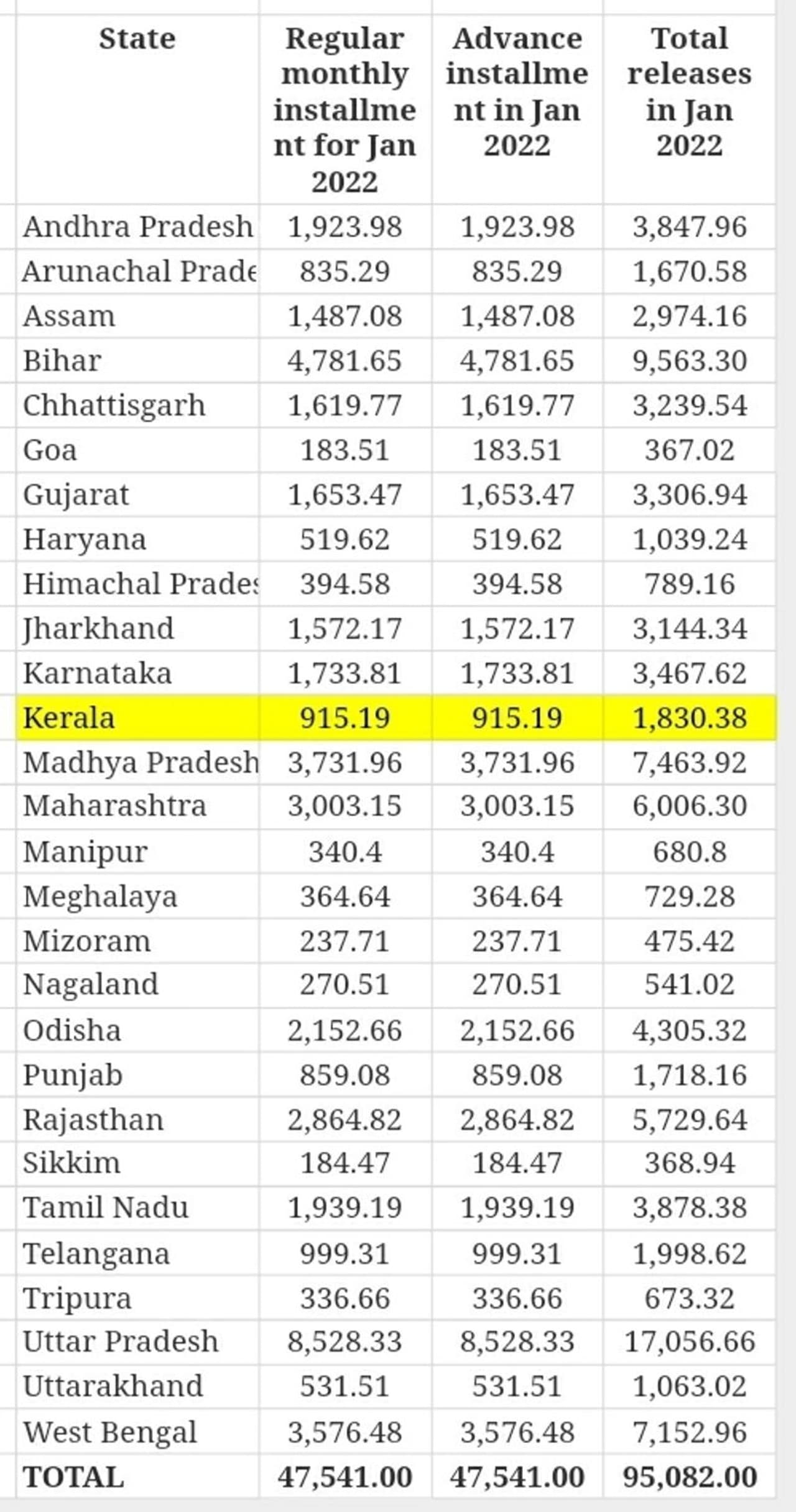 2022 ജനുവരി മാസത്തിൽ പതിവ് വിഹിതത്തിന്റെ ഇരട്ടി തുകയായ 95082 കോടി രൂപ സംസ്ഥാനങ്ങൾക്ക് ലഭിക്കും. കൈമാറിയ തുകയുടെ സംസ്ഥാന അടിസ്ഥാനത്തിലുള്ള കണക്ക് ഇതോടൊപ്പം ചേർക്കുന്നു.