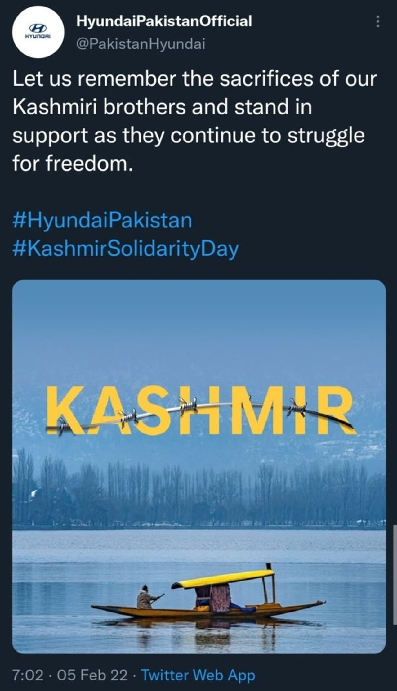 രണ്ട് ദിവസം മുൻപാണ് ഹ്യുണ്ടെ മോട്ടോർ കമ്പനിക്കെതിരായ വിവാദങ്ങളുടെ തുടക്കം. ഇവരുടെ പാക്കിസ്ഥാനി ഡീലർ ജമ്മു കശ്മീരിന്റെ പ്രത്യേക പദവി റദ്ദാക്കിയതിനെതിരെ കമ്പനിയുടെ ട്വിറ്റർ ഹാന്റിലിൽ ട്വീറ്റ് ചെയ്തു. ഹ്യുണ്ടെ പാകിസ്ഥാൻ ഒഫീഷ്യൽ (@PakistanHyundai) എന്ന ട്വിറ്റർ ഹാന്റിലിലായിരുന്നു ട്വീറ്റ്. മുള്ളുവേലികൊണ്ട് ബന്ധിപ്പിക്കപ്പെട്ട കശ്മീർ എന്ന വാക്കും ദാൽ തടാകത്തിലെ വള്ളവുമായിരുന്നു ട്വീറ്റിനൊപ്പമുണ്ടായിരുന്ന ചിത്രത്തിലേത്.