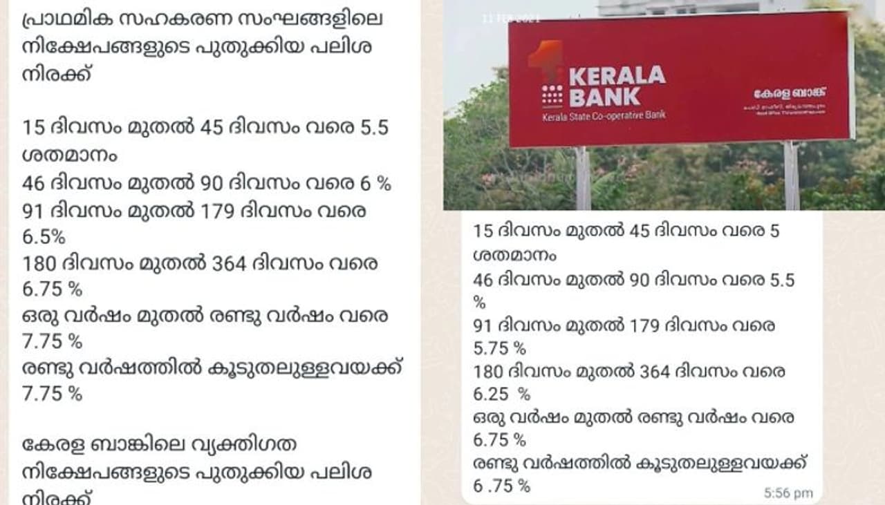 പ്രാഥമിക സഹകരണ സംഘങ്ങളിൽ 15 ദിവസം മുതൽ 45 ദിവസം വരെയുള്ള പലിശയ്ക്ക് 5.5 ശതമാനമാണ് പുതിയ പലിശ; രണ്ടു വർഷത്തിലേറെയുള്ള നിക്ഷേപങ്ങള്ക്ക് 7.75 ശതമാനം പലിശ