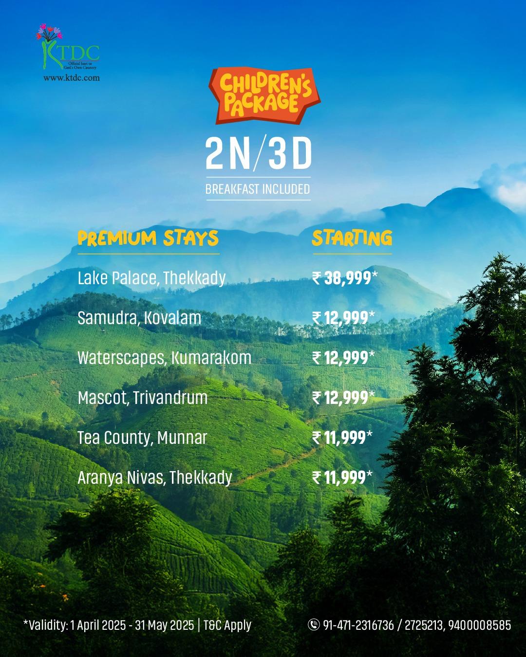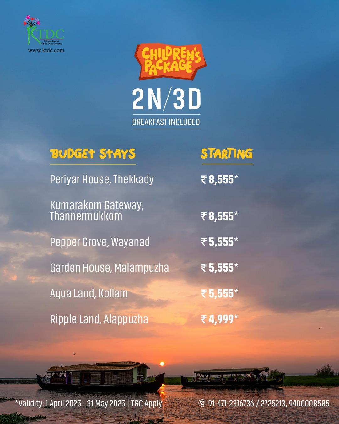 പ്രസ്തുത പാക്കേജുകൾ വളർന്നുവരുന്ന തലമുറയ്ക്ക് കേരളം കാണാനും അവസരം ഒരുക്കുന്നതിനായാണ് തയ്യാറാക്കിയിട്ടുള്ളത്. രക്ഷിതാക്കൾക്കും 12 വയസ്സിൽ താഴെയുള്ള കുട്ടികൾക്കും രണ്ട് രാത്രി/മൂന്നു പകലുകൾ ഉള്ള മുറി വാടക, പ്രാതൽ, നികുതി എന്നിവ ഉൾപ്പെടെ 4,555 രൂപ മുതൽ 38,999 രൂപ വരെയുള്ള പാക്കേജുകൾ 2025 മെയ് മാസം ലഭ്യമാണ്.