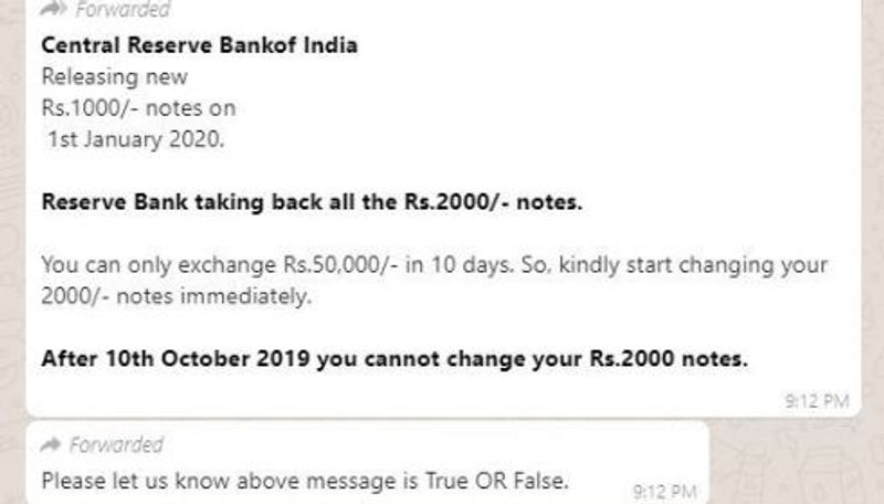 ഒക്ടോബര് പത്തിന് ശേഷം 2000 രൂപ നോട്ട് മാറ്റാനാകില്ലെന്ന സന്ദേശമാണ് ആദ്യം പ്രചരിച്ചത്. പിന്നീടും വ്യാജ സന്ദേശങ്ങള് സോഷ്യല് മീഡിയയില് സജീവമാണ്. 2000 രൂപ നോട്ട് ബാങ്കില് നല്കി മാറ്റിയെടുക്കണമെന്നാണ് വ്യാജ സന്ദേശങ്ങളുടെ കാതല്. 10 ദിവസത്തില് 50,000 രൂപമാത്രമേ മാറ്റാന് സാധിക്കൂ എന്നും ഇത്തരം സന്ദേശങ്ങള് പറയുന്നുണ്ട്..