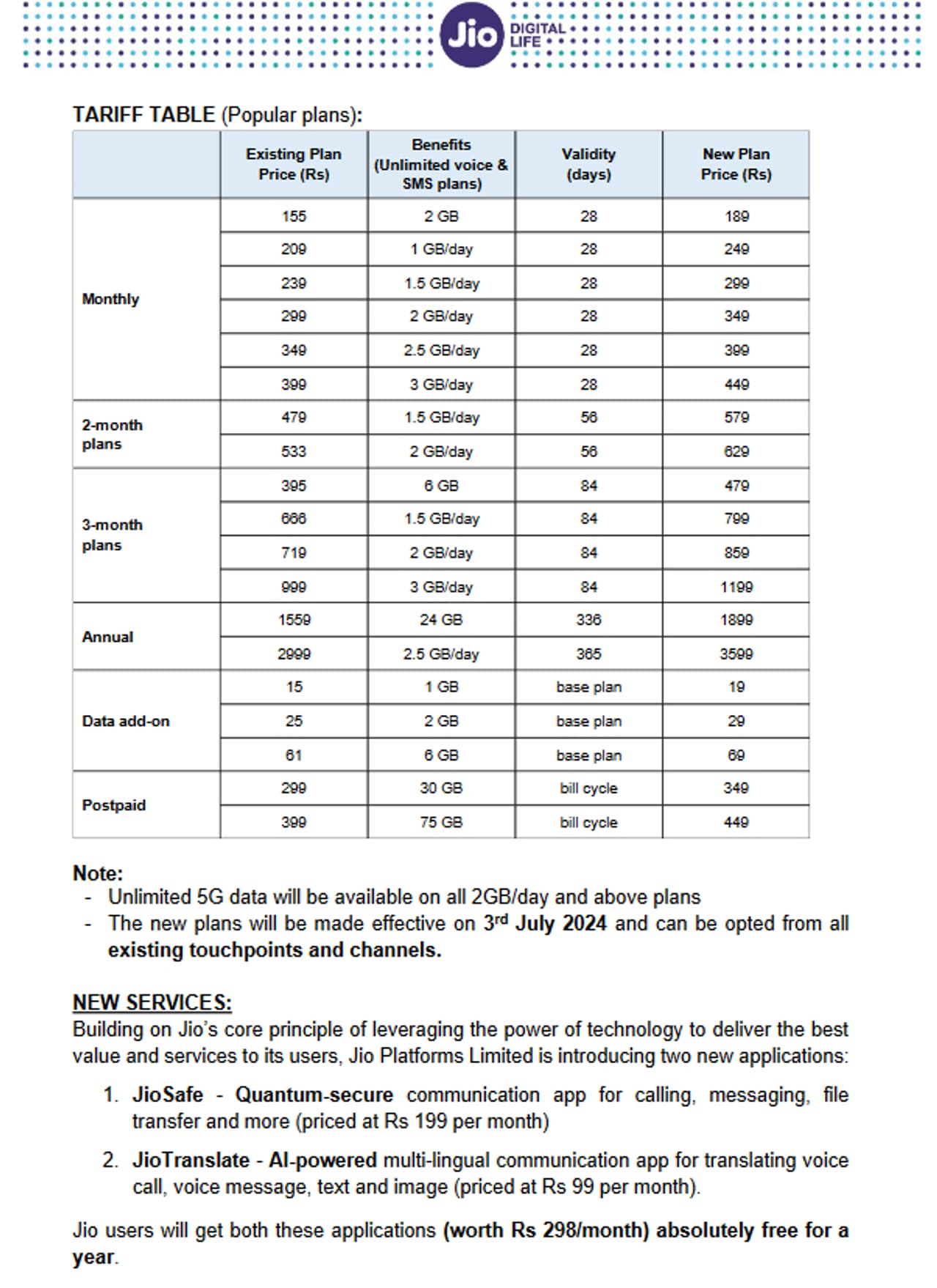 ഇന്ത്യയിലെ ഏറ്റവും വലിയ ടെലികോം ഓപ്പറേറ്ററായ റിലയൻസ് ജിയോ, അതിൻ്റെ പ്രീപെയ്ഡ്, പോസ്റ്റ്പെയ്ഡ് പ്ലാനുകളുടെ താരിഫ് വർധിപ്പിക്കുന്നു. രാജ്യത്തുള്ള ജിയോയുടെ ലക്ഷകണക്കിന് ഉപയോക്താക്കളെ ഇത് ബാധിച്ചേക്കും. പുതുക്കിയ നിരക്കുകൾ പ്രകാരം 600 രൂപ വരെ ഉയർന്നേക്കാം എന്നാണ് സൂചന. പുതുക്കിയ നിരക്കുകള് ജൂലൈ 3 മുതൽ പ്രാബല്യത്തിൽ വരും.