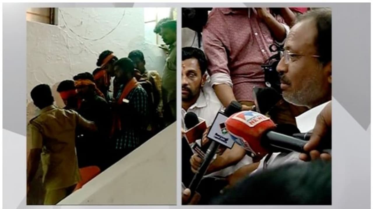 കസ്റ്റഡിയിലായ ഒമ്പത് പേരും കൊല്ലം പരൂര് സ്വദേശികളാണ്. ഇവരെ കസ്റ്റഡിയിലെടുത്തതിൽ പ്രതിഷേധിച്ച് ബിജെപി എംപിമാരായ വി.മുരളീധരനും നളിൻ കുമാർ കട്ടീലും ഒരു മണിക്കൂറോളം സന്നിധാനം പൊലീസ് സ്റ്റേഷനിൽ കുത്തിയിരുന്ന് പ്രതിഷേധിച്ചു. കർണാടകയിൽ നിന്നുള്ള എംപിയാണ് നളിൻകുമാർ കട്ടീൽ. ഇന്ന് രാവിലെ എംപിമാരടക്കമുള്ള ബിജെപി നേതാക്കൾ പ്രതിഷേധവുമായി സന്നിധാനത്തെത്തിയിരുന്നു.