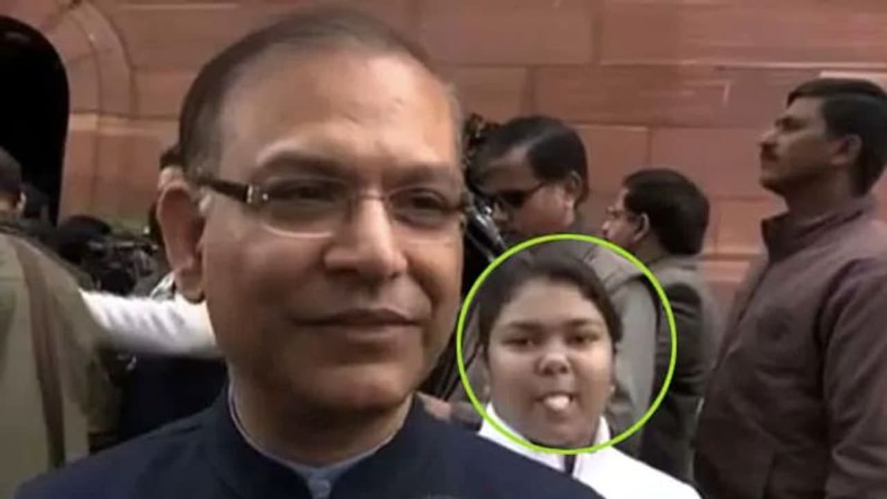 ദില്ലി: കേന്ദ്ര സിവില് ഏവിയേഷന് സഹമന്ത്രി ജയന്ത് സിന്ഹയുടെ പുറകിൽനിന്ന് 'ഗോഷ്ടി കാണിക്കുന്ന' പെൺകുട്ടിയുടെ വീഡിയോ സാമൂഹ്യമാധ്യമങ്ങളിൽ വൈറലാകുകയാണ്. കേന്ദ്ര ബജറ്റ് അവതരണത്തിനുശേഷം മാധ്യമങ്ങളോട് സംസാരിക്കുകയായിരുന്നു മന്ത്രി. അതിനിടയിലാണ് മന്ത്രിയുടെ പിറകിൽനിൽക്കുന്ന പെൺകുട്ടി ക്യാമറയിലേക്ക് നോക്കി ഗോഷ്ടി കാണിച്ചത്.