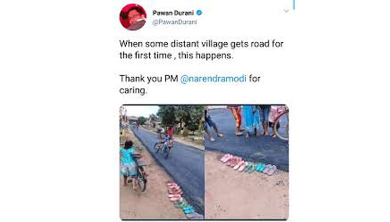 'ഒരു ഗ്രാമത്തില് ആദ്യമായി റോഡ് നിര്മ്മിച്ച് നല്കിയാല് ഇങ്ങനെയിരിക്കും. നന്ദി പ്രധാനമന്ത്രി' എന്ന കുറിപ്പോടെയാണ് ട്വിറ്ററില് ചിത്രം പോസ്റ്റ് ചെയ്തത്. എന്നാല് സത്യം പുറത്തുവന്നതോടെ ദുരാനി ഈ ട്വീറ്റ് ഡിലീറ്റ് ചെയ്തിരുന്നു. പക്ഷേ 5000 ലൈക്കും 2000 റീട്വീറ്റും ഇതിന് ലഭിച്ചിരുന്നു.
