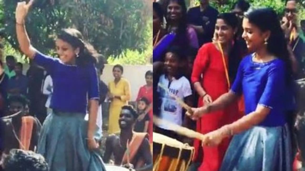 ആദ്യം ചെണ്ട കോലെടുത്ത് കൊട്ടിത്തുടങ്ങിയ പെണ്കുട്ടിയെ മേളക്കാരിലൊരാള് നൃത്തം ചെയ്യാന് ക്ഷണിച്ചതോടെ മേളക്കാരുടെ നടുവിലേക്കുച്ചെന്നായിരുന്നു പിന്നെ പെര്ഫോമന്സ്. പിന്നീട് 'ബാലേട്ടന് മോളല്ലേടി നിന്നെ ഞാന് ബാല്യത്തില് കണ്ടതല്ലേ..' എന്ന മേളത്തിനൊപ്പം കിടിലന് നൃത്തം ചെയ്യുന്ന പെണ്കുട്ടിയെയാണ് വീഡിയോയില് കാണുന്നത്.