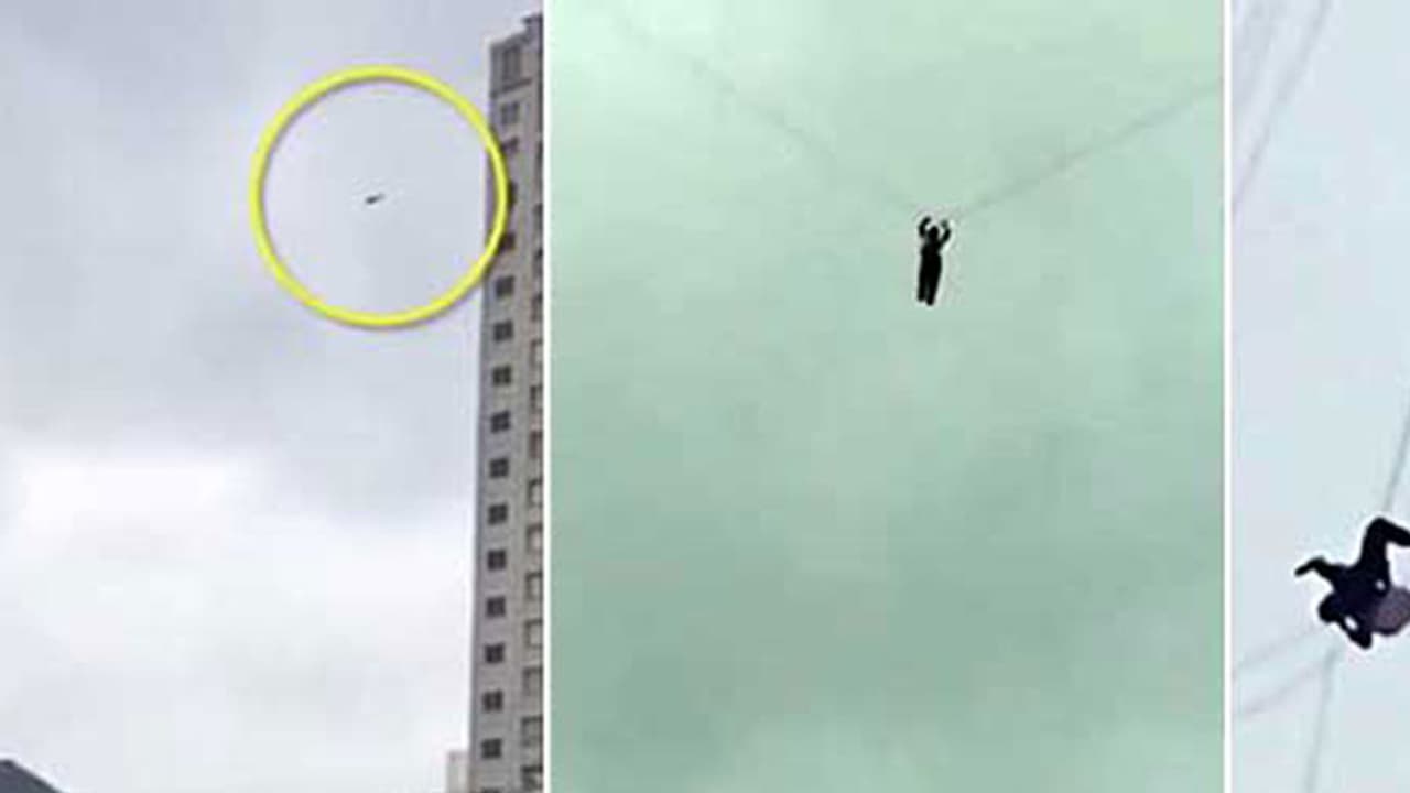 അപ്പോഴേക്കും ഇയാളുടെ ആകാശനടത്തം കാണാൻ ആളുകൾ താഴെക്കൂടിയിരുന്നു. യാത്രയ്ക്കിടെ മറ്റൊരു കേബിളിൽ കുടുങ്ങി ആൾ ആകാശത്ത് തൂങ്ങിക്കിടന്നു. ഇതു കണ്ടപ്പോൾ താഴെ നിന്ന ആളുകൾക്ക് കാര്യം അത്ര പന്തിയല്ലെന്ന് മനസിലായി. ഉടൻതന്നെ ഫയർ ഫോഴ്സിനെ വിവരമറിയിച്ചു. ഫയർഫോഴ്സ് എത്തിയാണ് കേബിളുകൾക്കിടയിൽ കുടുങ്ങിക്കിടന്ന അയാളെ രക്ഷപ്പെടുത്തിയത്. ഏതായാലും ഇയാൾ ഇപ്പോൾ പോലീസ് കസ്റ്റഡിയിലാണ്.