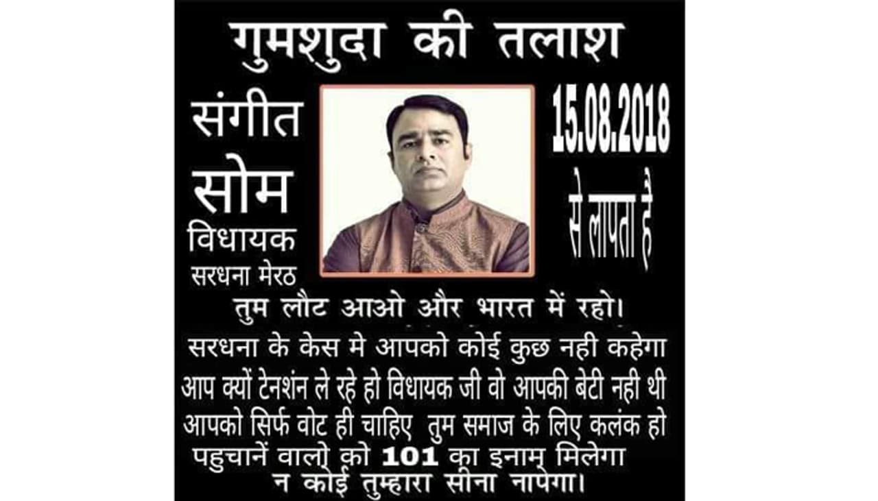 "ആഗസ്ത് 15 മുതൽ സംഗീത് സോമിനെ കാണാനില്ല. സർധാന സംഭവവുമായി ബന്ധപ്പെട്ട് നിങ്ങളോട് ആരും ഒന്നും പറയില്ല. നിങ്ങൾ സമ്മർദ്ദത്തിലാകേണ്ട, കാരണം അത് നിങ്ങളുടെ മകളല്ല. നിങ്ങൾ സമൂഹത്തിന് അപമാനകരമാണ്, വോട്ടുകളാണ് നിങ്ങളുടെ പ്രധാന ആശങ്ക. ആരും നിങ്ങളുടെ നെഞ്ച് അളക്കാൻ പോകുന്നില്ല. സോമ് എവിടെയാണെന്നുള്ളതിനെക്കുറിച്ച് വിവരം നൽകുന്നവർക്ക് 101 രൂപ പ്രതിഫലം നൽകും”- എന്ന കുറിപ്പോടെയുള്ള സന്ദേശമാണ് പ്രചരിച്ചിരുന്നത്.