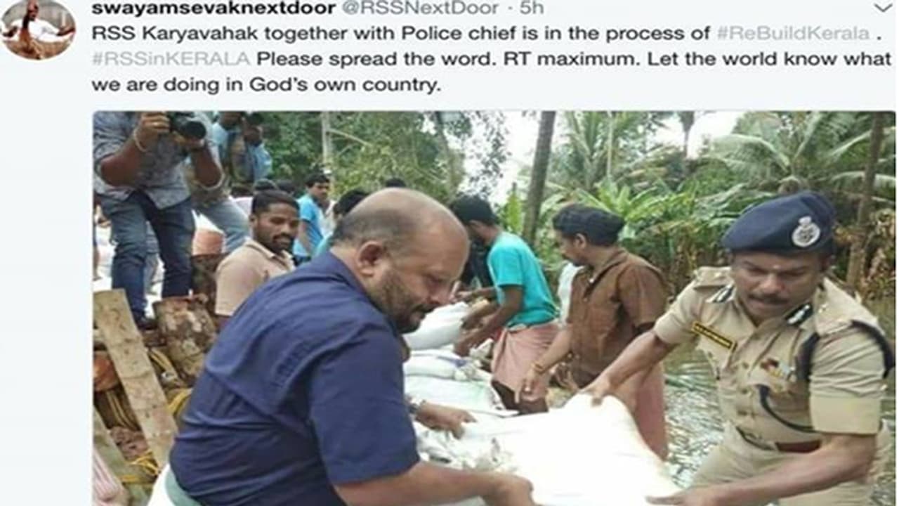 അതിനിടയിലാണ് ദുരിതമുഖത്ത് ശക്തമായ പ്രവര്ത്തനം നടത്തുന്ന ആര്എസ്എസ് കാര്യവാഹക് എന്ന നിലയില് ഒരു ചിത്രം ദേശീയ തലത്തില് വലിയ ചര്ച്ചയായത്. സംഭവം മറ്റൊന്നുമല്ല, ചിത്രത്തിലുള്ള ആളാണ് വിഷയം. ആര് എസ് എസ് കാര്യവാഹക് എന്നു പറഞ്ഞ് വിഎസ് സുനില്കുമാറെന്ന സിപിഐയുടെ മന്ത്രി രക്ഷാപ്രവര്ത്തനത്തിലേര്പ്പെടുന്ന ഫോട്ടോയാണ് പ്രചരിപ്പിക്കുന്നത്.