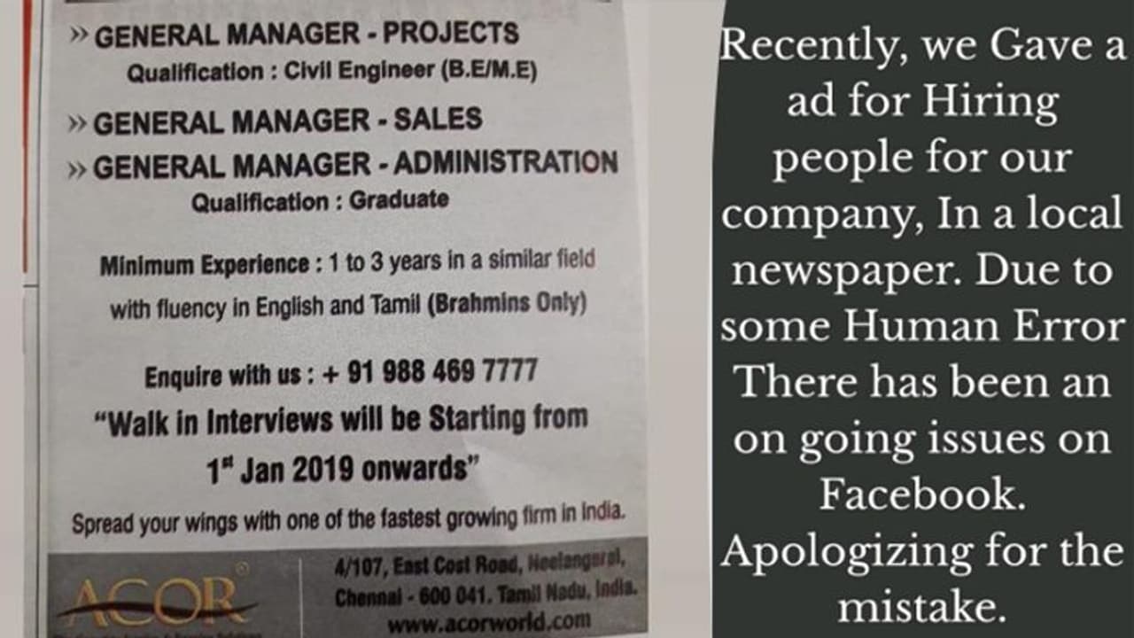 ചെന്നൈ: ജോലി ഒഴിവുകളിൽ ബ്രാഹ്മണർക്ക് മാത്രം അവസരമെന്ന് കാണിച്ച് നൽകിയ പരസ്യത്തിനെതിരെ വിമര്ശനം രൂക്ഷമായതോടെ ക്ഷമാപണവുമായി സ്വകാര്യ കമ്പനി. ചെന്നൈ കേന്ദ്രമാക്കി പ്രവർത്തിക്കുന്ന സ്വകാര്യ ഇന്റീരിയർ ഡിസൈൻ കമ്പനിയായ അക്കോർ ആണ് അഡയാർ ടോക്ക് എന്ന് പ്രാദേശിക പത്രത്തില് പരസ്യം നൽകിയത്.