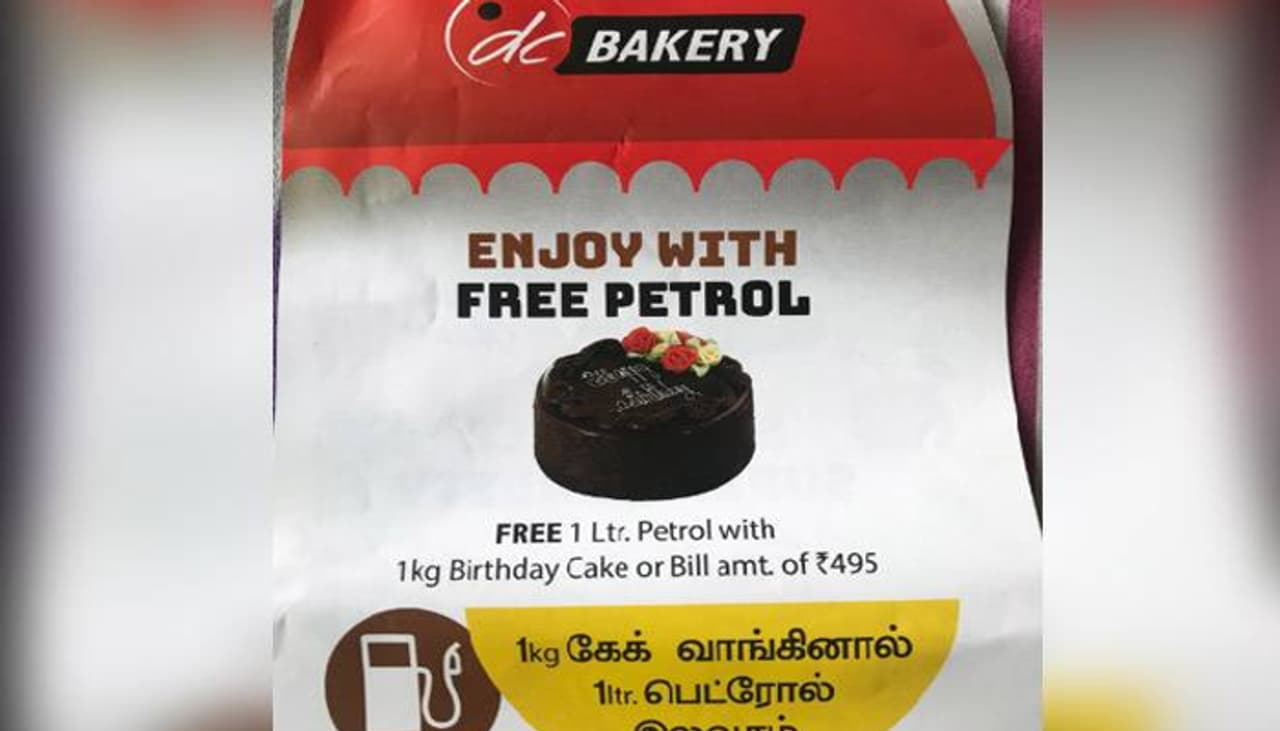 495 രൂപ വിലയുള്ള ഒരു ബര്ത്ത് ഡേ കേക്ക് വാങ്ങിയാലാണ് ഒരു ലിറ്റര് പെട്രോള് സൗജന്യമായി ലഭിക്കുക