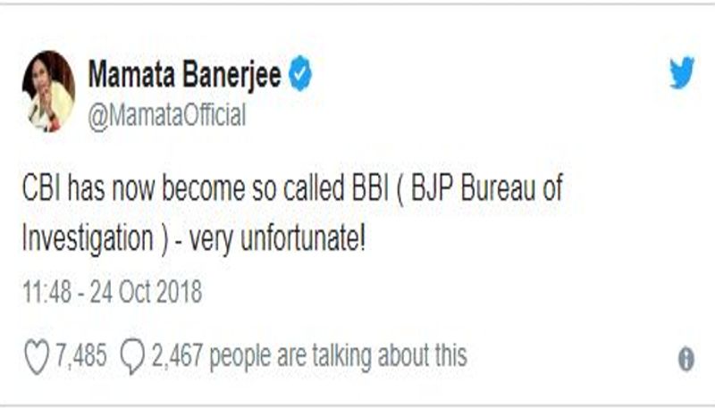 ബിജെപി ബ്യൂറോ ഓഫ് ഇൻവെസ്റ്റിഗേഷൻ എന്ന് പറഞ്ഞാണ് മമത ബാനർജി സിബിഐയെ വിശേഷിപ്പിച്ചത്. ട്വിറ്ററിലൂടെയായിരുന്നു മുഖ്യമന്ത്രിയുടെ ആക്ഷേപം. സിബിഐ ഇപ്പോൾ ബിബിപിയായെന്നും ഇത് ദൗർഭാഗ്യകരമായ സംഭവമാണെന്നും മമത ബാനർജി ട്വീറ്റ് ചെയ്തു.