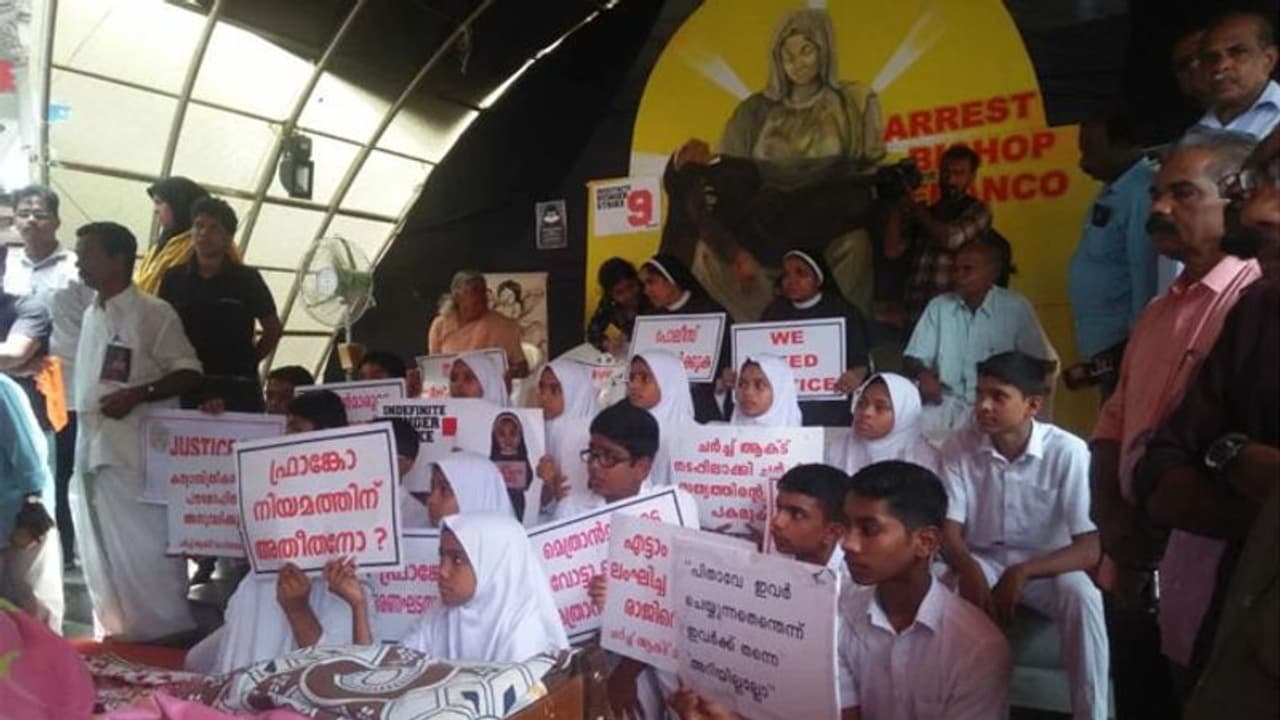പീഡനകേസില് കുറ്റാരോപിതനായ ഫാദര് ഫ്രാങ്കോ മുളയ്ക്കലിനെ അറസ്റ്റ് ചെയ്യണമെന്നാവശ്യപ്പെട്ടാണ് സെപ്തംബര് 8 കന്യാസ്ത്രീകള് കൊച്ചിയില് സമരം സംഘടിപ്പിച്ചത്. മിഷണറീസ് ഓഫ് ജീസസ് സഭാംഗമായ കന്യാസ്ത്രീയാണ് ജലന്ധര് രൂപത മുന് ബിഷപ്പായിരുന്ന ഫ്രാങ്കോ മുളയ്ക്കലിനെതിരെ ലൈംഗീക പീഡന പരാതി നല്കിയത്. 2014 മുതല് 2016 വരെയുള്ള കാലയളവില് 13 തവണ കുറുവിലങ്ങാട് മഠത്തില് വച്ച് പീഡിപ്പിച്ചുവെന്നാണ് പരാതി.