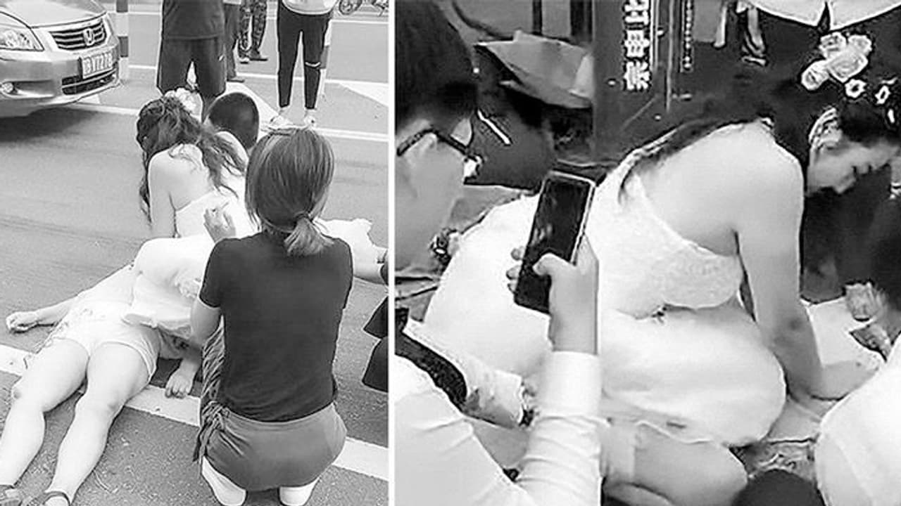 ഭർത്താവ് ഒന്നിച്ചുള്ള വിവാഹ ഫോട്ടോ ഷൂട്ടിനിടെയാണ് ഷി ദാൻ എന്ന യുവതി അപകടത്തിൽപ്പെട്ട സ്ത്രീയെ രക്ഷിക്കുന്നതിനായി വിവാഹ വേഷത്തിൽ റോഡിലേക്ക് ഒാടിയത്. ചൈനയിലെ ലിയോണിങ് പ്രവിശ്യയിലെ വഫാംഗഡിൻ നഗരത്തിലാണ് സംഭവം നടന്നത്.