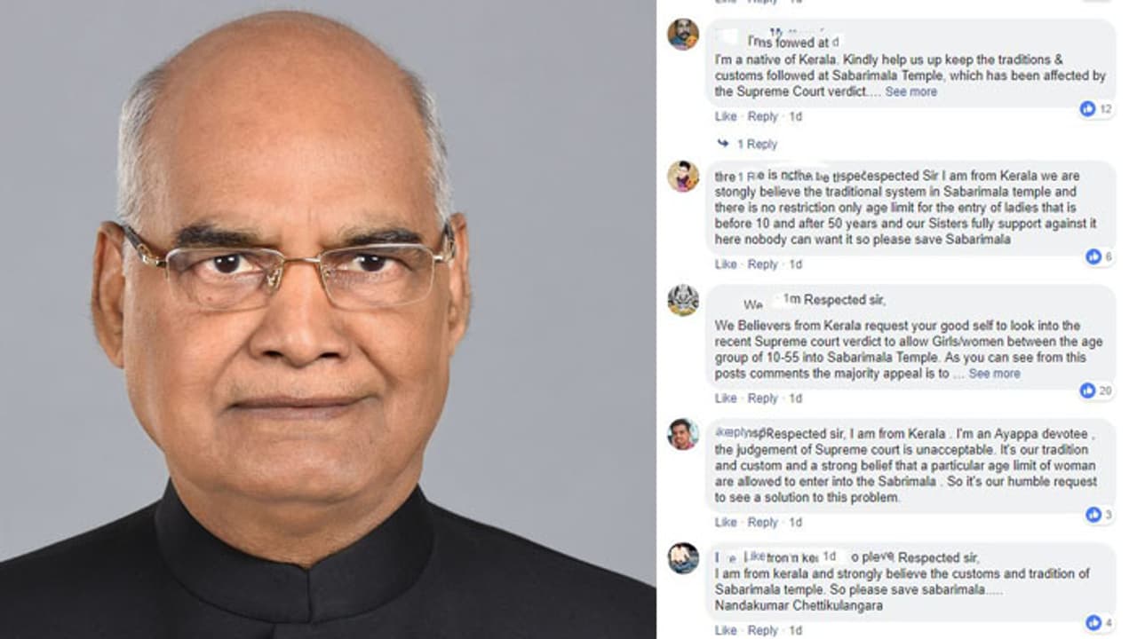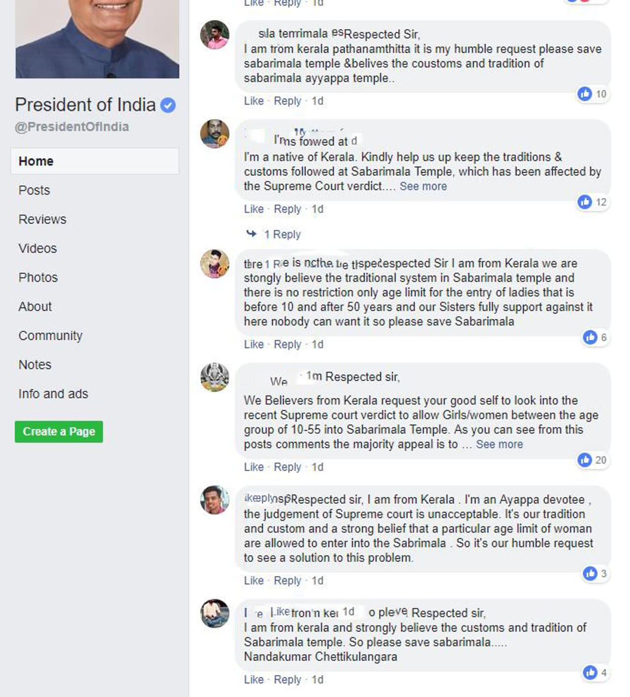 ഇതരമതവിഭാഗങ്ങളില്പ്പെട്ടരും മറ്റ് സംസ്ഥാനങ്ങളിലുള്ളവരും സ്ത്രീകളും അടക്കം ആയിരക്കണക്കിന് പേരാണ് രാഷ്ട്രപതിയുടെ പേജില് സ്ത്രീപ്രവേശനത്തിനെതിരെ പരാതി പോസ്റ്റ് ചെയ്തിരിക്കുന്നത്. തങ്ങളെ സ്വയം പരിചയപ്പെടുത്തിക്കൊണ്ടാണ് പലരും പരാതി കമന്റായി പോസ്റ്റ് ചെയ്തിരിക്കുന്നത്
