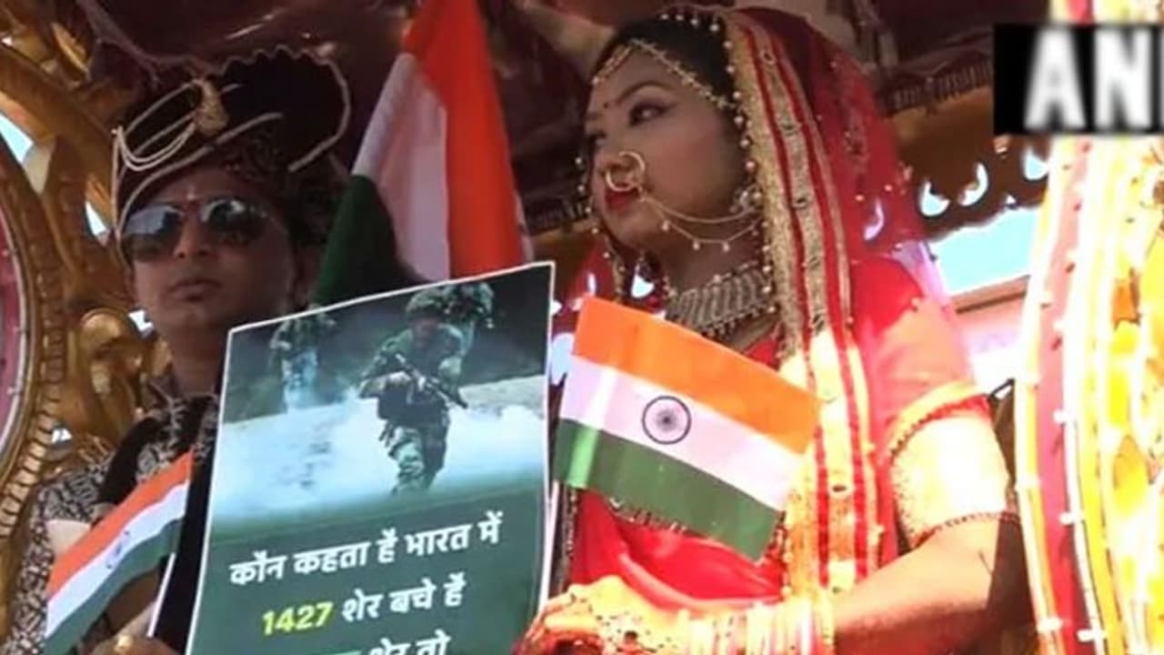 'ആരാണ് പറഞ്ഞത് ഇന്ത്യയില് ഇനി 1427 സിംഹങ്ങളേ അവശേഷിക്കുന്നുള്ളൂവെന്ന്. 13 ലക്ഷം സിംഹങ്ങളാണ് അതിര്ത്തിയില് രാജ്യത്തെ കാക്കാനായി ഉള്ളത്' എന്നെഴുതിയ പ്ലക്കാര്ഡാണ് വധു കൈയില് പിടിച്ചത്. റാലിയിലെ മുഴുവൻ ആളുകളും ദേശീയ പതാക കൈയ്യിലേന്തിയാണ് വഡോദര ഗ്രാമത്തിലൂടെ ദമ്പതികൾക്കൊപ്പം വിവാഹയാത്രയിൽ പങ്കെടുത്തത്.