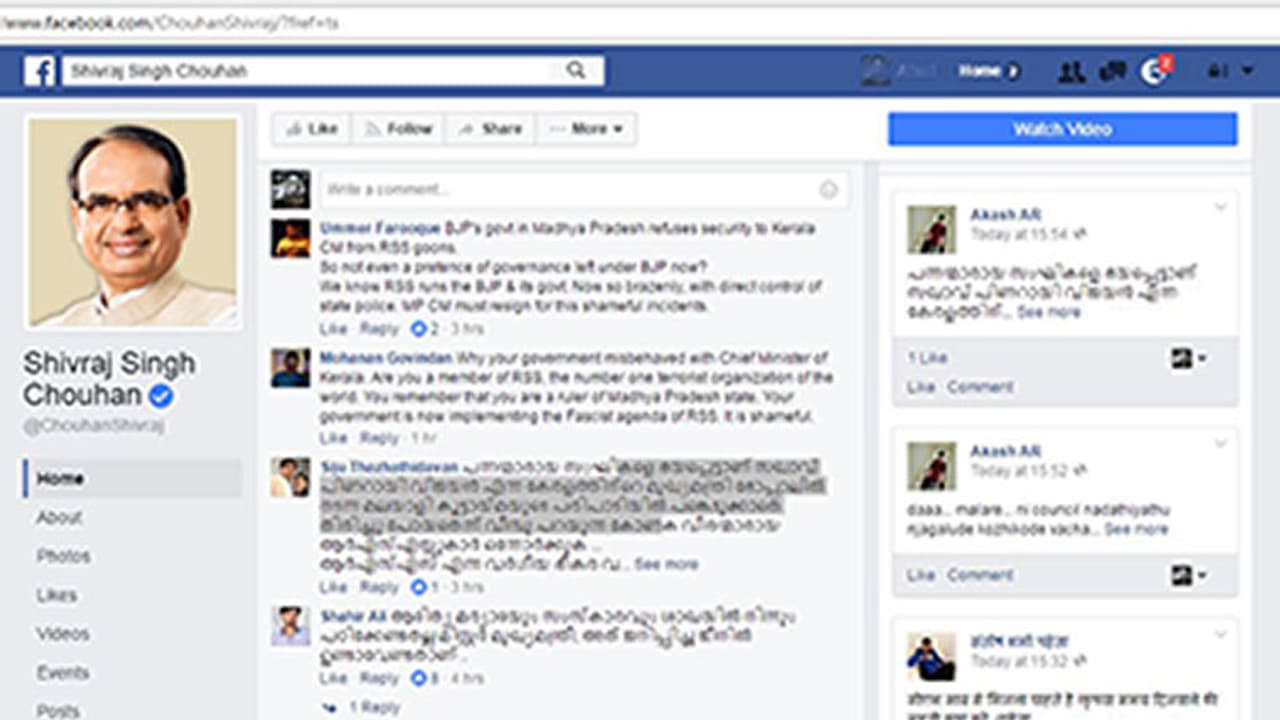 ഭോപ്പാലില് കഴിഞ്ഞ ദിവസം മുഖ്യമന്ത്രി പിണറായി വിജയനെ പൊതുപരിപാടിയില് പങ്കെടുക്കുന്നതില് നിന്ന് പൊലീസ് തടഞ്ഞതില് പ്രതിഷേധിച്ച് മലയാളികളുടെ സൈബര് ആക്രമണം. മദ്ധ്യപ്രദേശ് മുഖ്യമന്ത്രി ശിവരാജ് സിങ് ചൗഹാന്റെ ഫേസ്ബുക്ക് പേജിലാണ് ഇന്നലെ മുതല് മലയാളികളുടെ തെറിയഭിഷേകം തുടങ്ങിയത്. പലരും പച്ചമലയാളത്തില് തന്നെയാണ് ശിവരാജ് സിങ് ചൗഹാനെ മര്യാദ പഠിപ്പിക്കുന്നത്. കേരളത്തില് ആരെയും ഭയക്കാതെ കോഴിക്കോട് ബി.ജെ.പിക്ക് ദേശീയ നേതൃയോഗം നടത്താന് കഴിഞ്ഞത് കണ്ടുപഠിക്കണമെന്നും അതാണ് കേരളത്തിന്റെ സംസ്കാരമെന്നും ഉപദേശിക്കുന്നുമുണ്ട്. കമന്റുകള്ക്ക് മറുപടി നല്കാനും തിരിച്ച് ആക്രമിക്കാനും ബി.ജെ.പി, ആര്.എസ്.എസ് പ്രവര്ത്തകരും പേജില് സജീവമായിട്ടുണ്ട്.