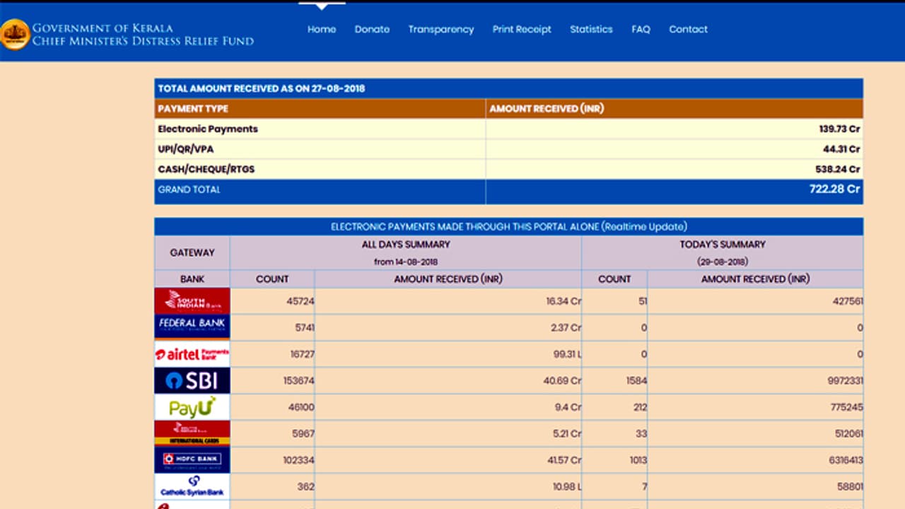 മുഖ്യമന്ത്രിയുടെ ദുരിതാശ്വാസ നിധിയിലേക്ക് വരുന്ന പണത്തിന്റെ തത്സമയ വിവരങ്ങള് വെബ്സൈറ്റിലൂടെ അറിയാം