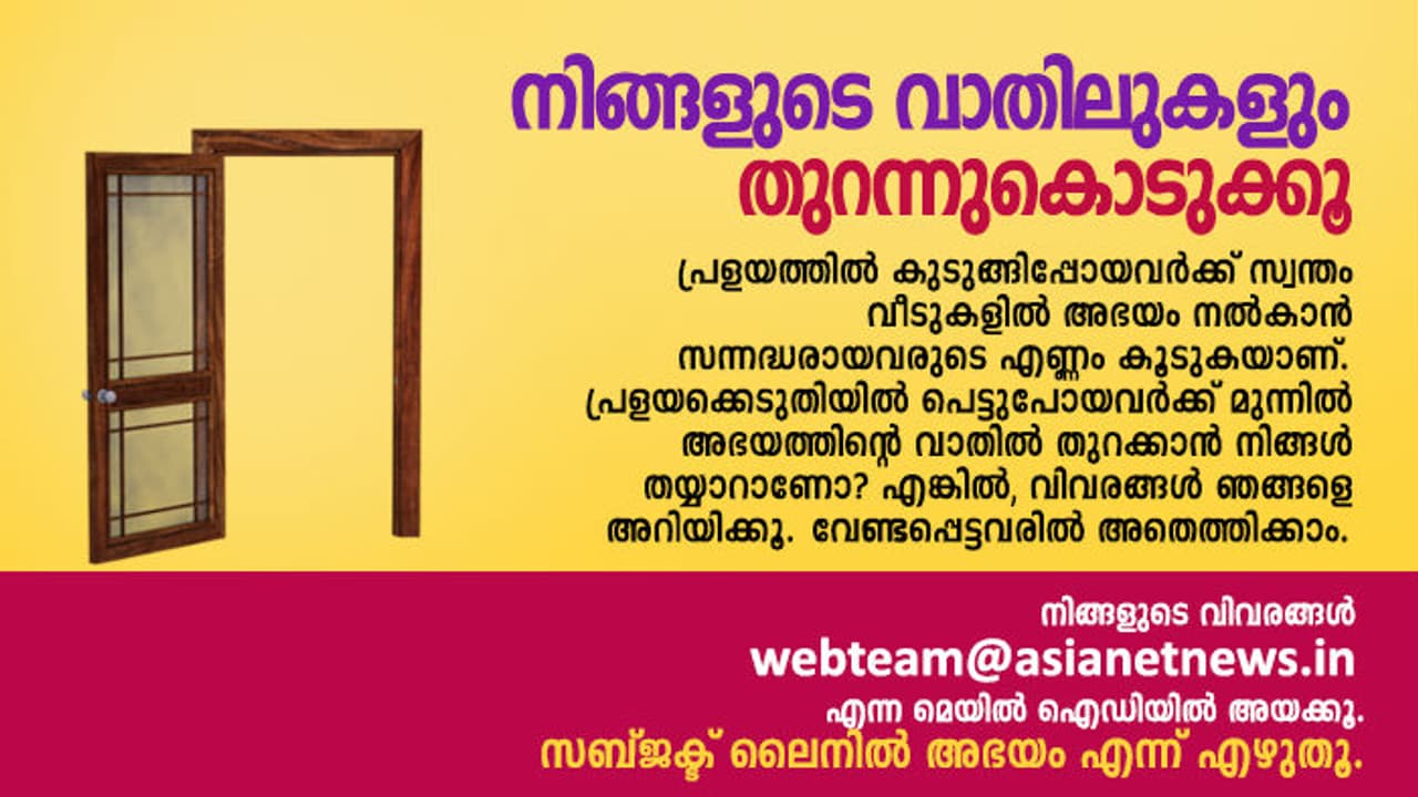 സഹായം വാഗ്ദാനം ചെയ്ത് നിരവധി ആളുകളാണ് മുന്നോട്ടുവരുന്നത്. നിങ്ങള് സുരക്ഷിതരാണെങ്കില്, സഹായിക്കാന് മനസ്സുണ്ടെങ്കില് ഞങ്ങളെ അറിയിക്കൂ, webteam@asianetnews.in എന്ന മെയില് ഐഡിയിലേക്ക് വിശദാംശങ്ങള് അയക്കാവുന്നതാണ്. ആലുവ, മട്ടാഞ്ചേരി, അടൂര് തുടങ്ങിയ ഇടങ്ങളില് അഭയമൊരുക്കിയിരിക്കുന്നു