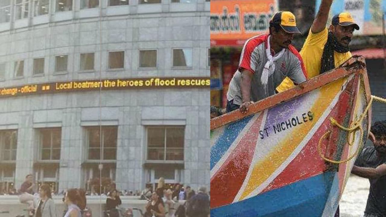 സംസ്ഥാനത്തെ പ്രളയക്കെടുതിയില് മത്സ്യത്തൊഴിലാളികള് നടത്തിയ രക്ഷാപ്രവര്ത്തനത്തിന്റെ വീരഗാഥ ലണ്ടനിലെ സാന്പത്തിക കേന്ദ്രമായ കാനറി വാര്ഫിന്റെ ചുമരുകളിൽ പ്രത്യക്ഷപ്പെട്ടിരിക്കുകയാണ്. കാനറി വാര്ഫ് കെട്ടിടത്തിന്റെ ചുമരുകളില് സ്ഥാപിച്ചിട്ടുള്ള റോയിട്ടേഴ്സിന്റെ വാര്ത്താ ബോര്ഡിലാണ് അവരുടെ വാർത്തകൾ തെളിഞ്ഞത്.
