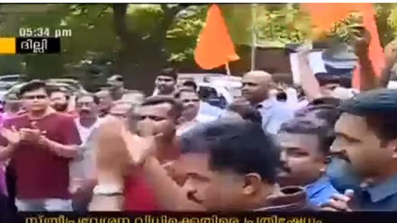 സ്ത്രീപ്രവേശനത്തിനെതിരെ വിവിധ ഹിന്ദു സംഘടനകള് ശേഖരിച്ച ഒപ്പുകള് കേരളാ ഹൗസിലെത്തി സമര്പ്പിക്കാനെത്തിയതായിരുന്നു പ്രതിഷേധക്കാര്. തുടര്ന്ന് കേന്ദ്ര കമ്മിറ്റി കഴിഞ്ഞ് തിരിച്ചെത്തിയ സിപിഎം നേതാക്കള്ക്കെതിരെ ഇവര് പ്രതിഷേധിച്ചു. ശക്തമായ പ്രതിഷേധത്തെ തുടര്ന്ന് മന്ത്രി ഇ.പി ജയരാജന് കേരളാ ഹൗസില് പ്രവേശിക്കാന് സാധിച്ചില്ല, തുടര്ന്ന് തിരികെ പോവുകയായിരുന്നു.