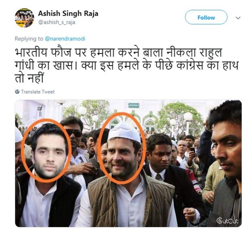 അക്കൂട്ടത്തില് ഏറ്റവും പ്രധാനം പുല്വാമയിലെ ചാവേര് ആക്രമണം നടത്തിയ തീവ്രവാദി ആദില് അഹമ്മദ് ദറിനൊപ്പം രാഹുല് ഗാന്ധി നില്ക്കുന്ന ഫോട്ടോയാണ്. സോഷ്യല് മീഡിയയില് ഈ ചിത്രം വ്യാപകമായി പ്രചരിക്കുകയാണ്. എന്നാല് തീവ്രവാദിക്കൊപ്പം രാഹുല് നില്ക്കുന്ന ചിത്രം വ്യാജമാണെന്ന് തെളിവുകള് നല്കി പൊളിച്ചടുക്കുകയാണ സോഷ്യല് മീഡിയ.