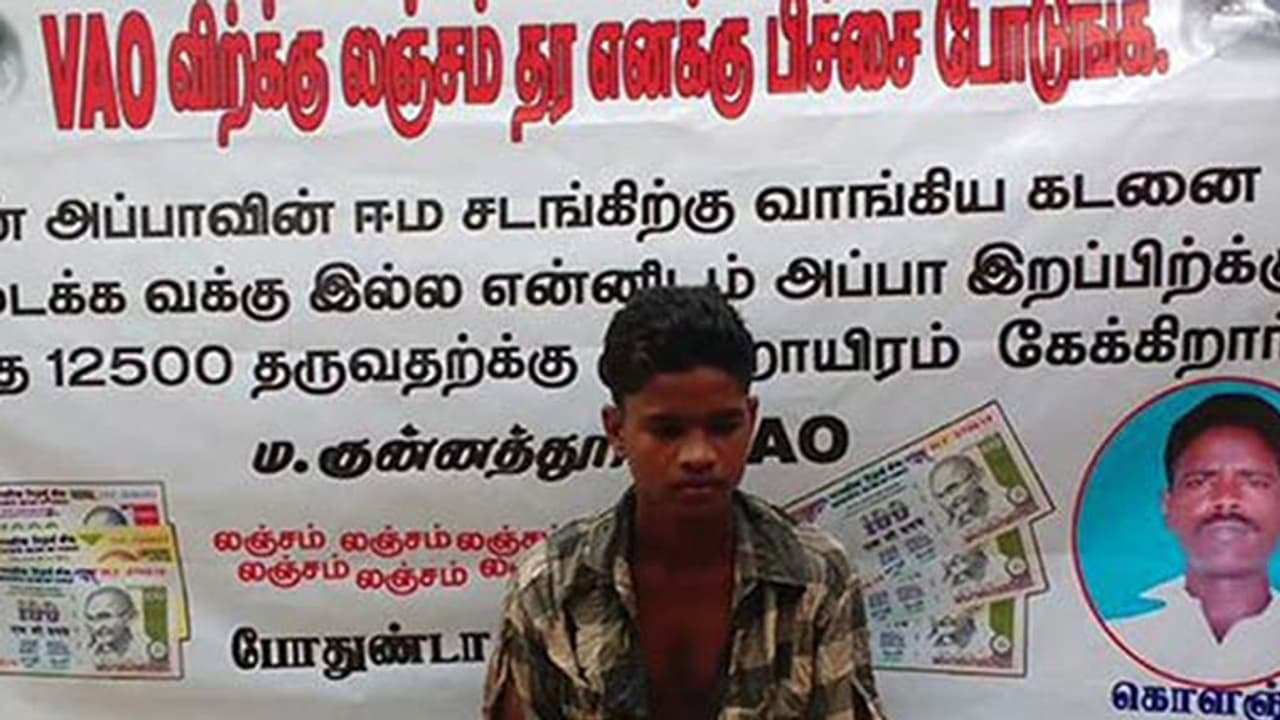 ഉദ്യോഗസ്ഥന് ചോദിച്ച 300 രൂപ കൈക്കൂലി കൊടുക്കാന് അജിത്ത് ഒരു മാസമായി തെരുവില് ഭിക്ഷയെടുക്കുന്നു. ഭിക്ഷ യാചിക്കുന്നതിന് കാരണമെഴുതിയ ഫ്ലക്സും ചുമന്നാണ് അജിത്ത് തെരുവുകളിലും ബസ്സുകളിലും റെയില്വേസ്റ്റേഷനുകളിലും അലയുന്നത്. അച്ഛന്റെ മരണാനന്തര ചടങ്ങുകള്ക്ക് കടം വാങ്ങിയ 15,000 രൂപയുടെ കടമുണ്ട് അജിത്തിന്. അതും വീട്ടണം. എന്നാല് തെറ്റായ ആരോപണമുന്നയിച്ചതിന് അജിത്തിനെതിരെ നിയമനടപടി സ്വീകരിയ്ക്കുമെന്നാണ് പഞ്ചായത്തധികൃതര് പറയുന്നത്. ഒഡിഷയിലെ ദനാ മാഞ്ചിയ്ക്കും ഇങ്ങ് തമിഴ്നാട്ടിലെ അജിത്തിനും പണമില്ലെങ്കില് നീതിയില്ലെന്ന് തെളിയിയ്ക്കുകയാണ് ഈ സംഭവവും.